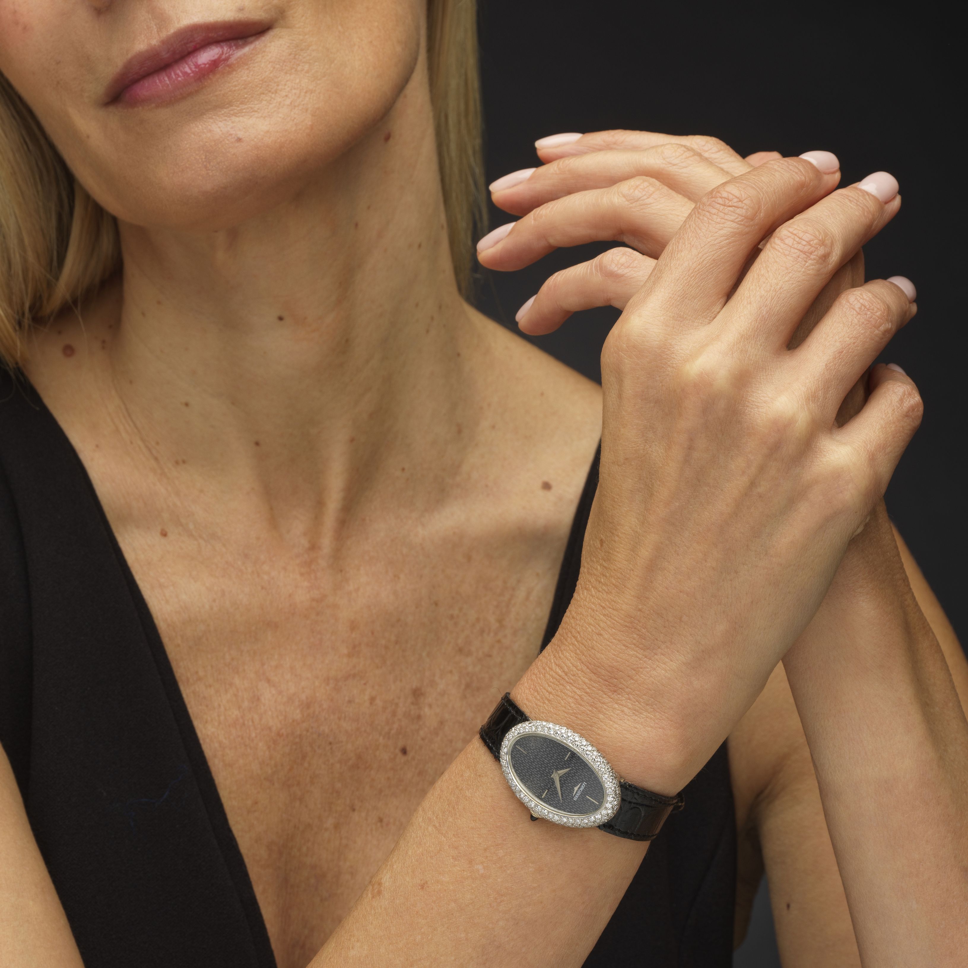 Cadran noir à traits gris, aiguilles et index bâtons argentés, or gris 750, 35x22 mm, poids brut 24 g