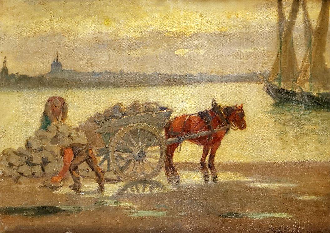 Le déchargement de pierres en rade de Genève, huile sur toile, 32x45 cm