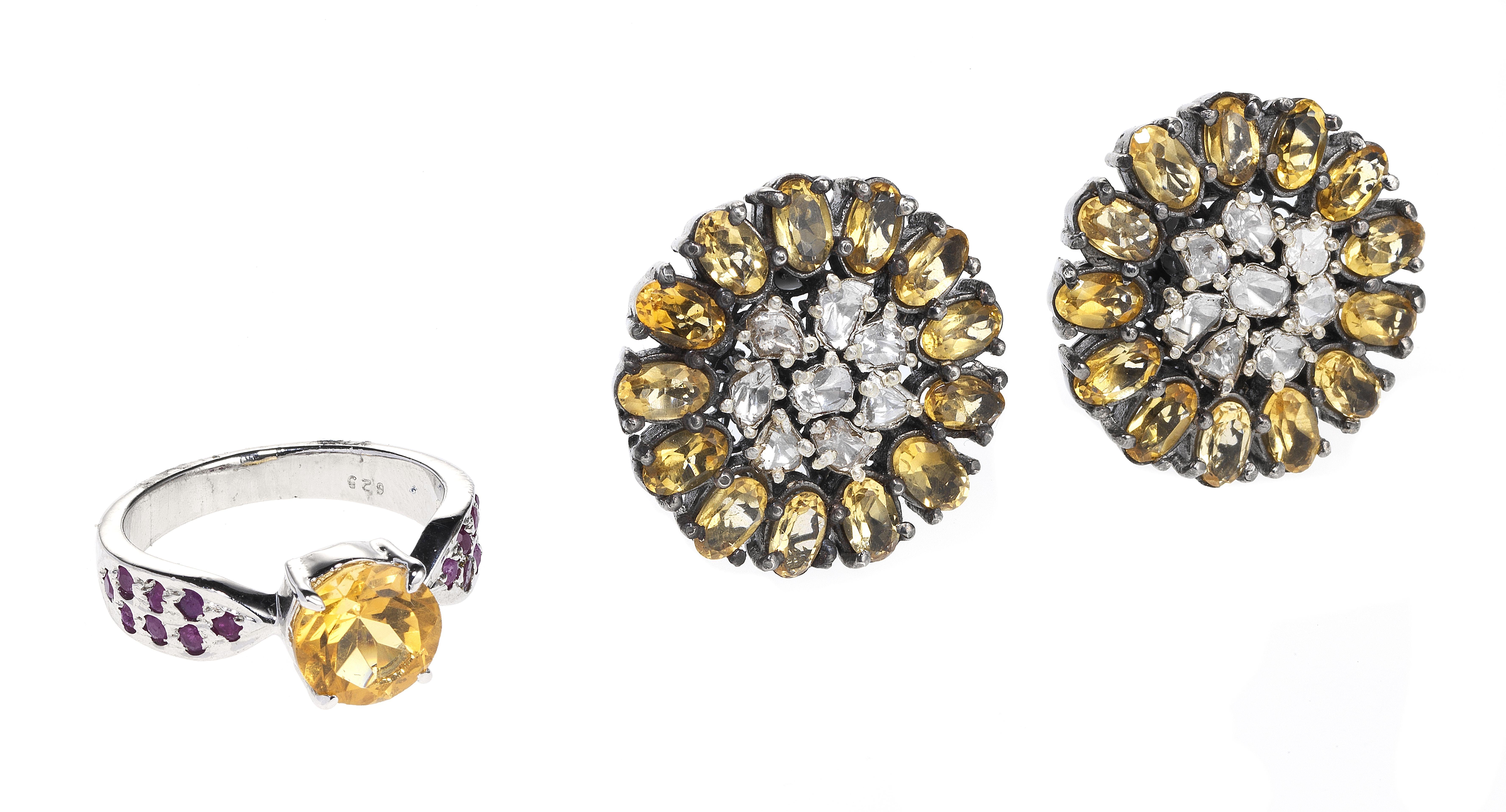 La première sertie d'une citrine taille brillant épaulée de rubis, les secondes centrées de diamants en table entourées de citrines taille ovale, argent 925, doigt 53-13, D 2 cm. Pour les lots précédés d'un *, la TVA de 7,7% est due sur l'entier du prix d'adjudication.