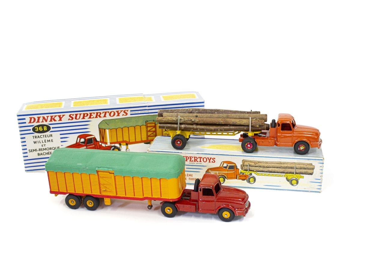 Un tracteur Willème et une semi-remorque bâchée (36B) et un tracteur Willème avec semi-remorque Fardier (36A), avec leur boîte.