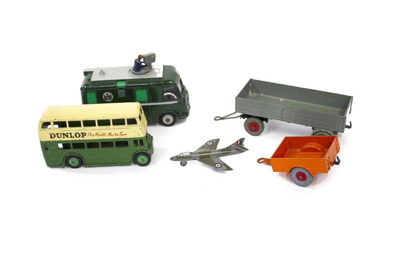 Une remorque (341), un avion Hawker Hunter (736), un bus Imperial Dunlop (290), une remorque (428) et un TV Roving Eye (968), L de 7 à 10,5 cm