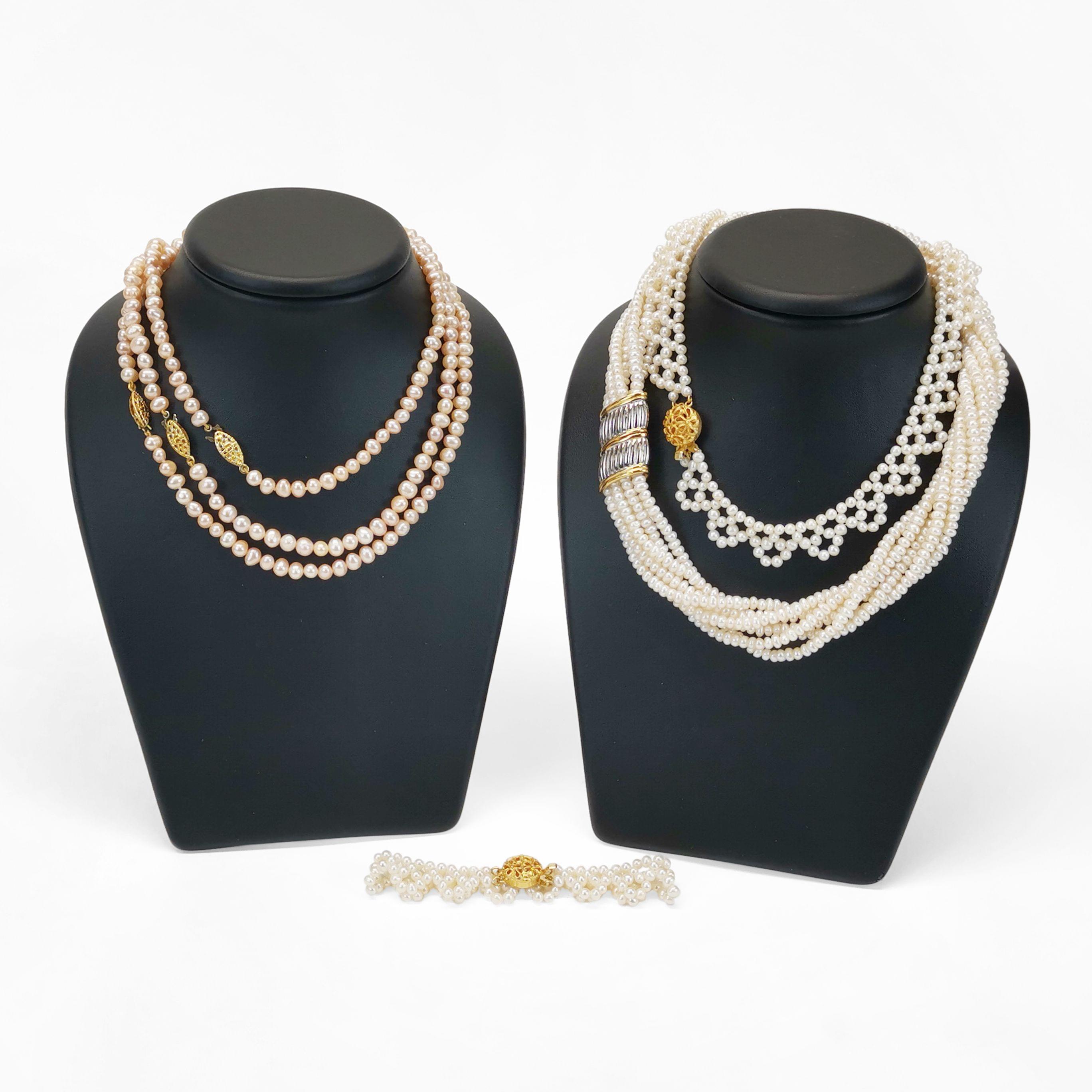 Trois colliers de perles d'eau douce rosées, un collier multi-rangs de perles d'eau douce blanches torsadées, un collier et un bracelet de perles d'eau douce tissées, fermoirs en métal doré, L colliers entre 41 et 45 cm, L bracelet 22 cm