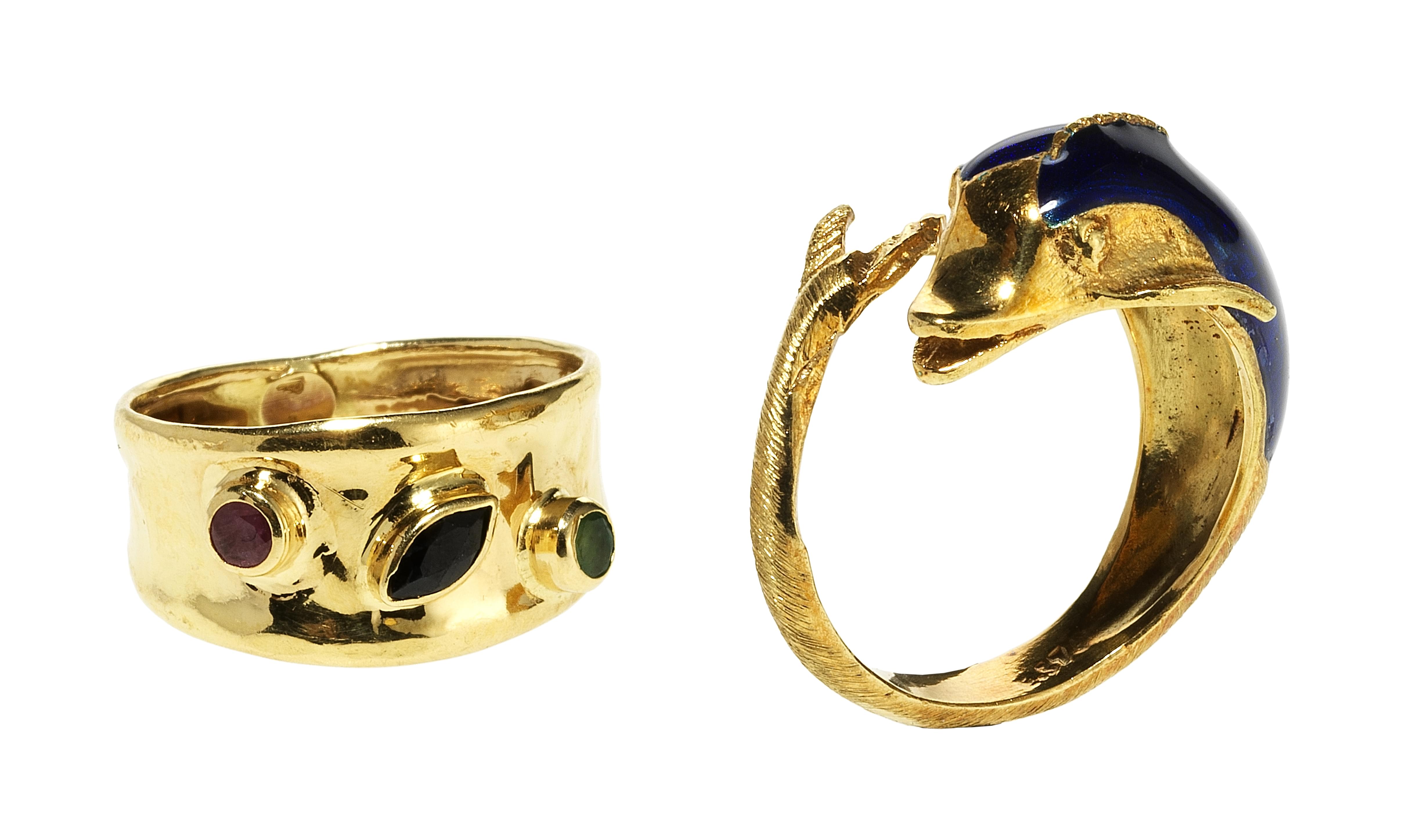 L'une à motif de dauphin émaillé bleu et l'autre centrée d'un saphir taille marquise épaulé d'un rubis et d'une émeraude, or 750, doigt 52-12 et 53-13, 8 g