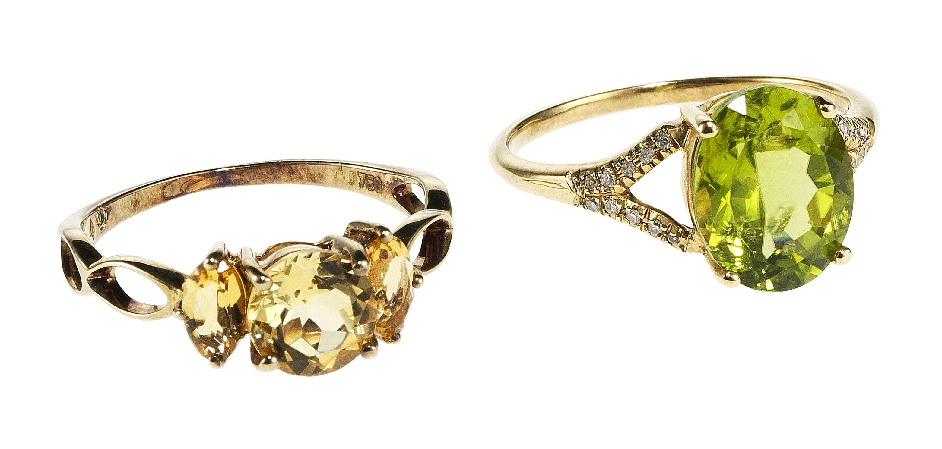 L'une sertie d'un péridot taille ovale épaulée de petits diamants et l'autre sertie d'une citrine taille brillant épaulée de deux citrines taille marquise, or 750 et or 375, doigt 52-12 et 51-11, 4 g. Pour les lots précédés d'un *, la TVA de 7,7% est due sur l'entier du prix d'adjudication.