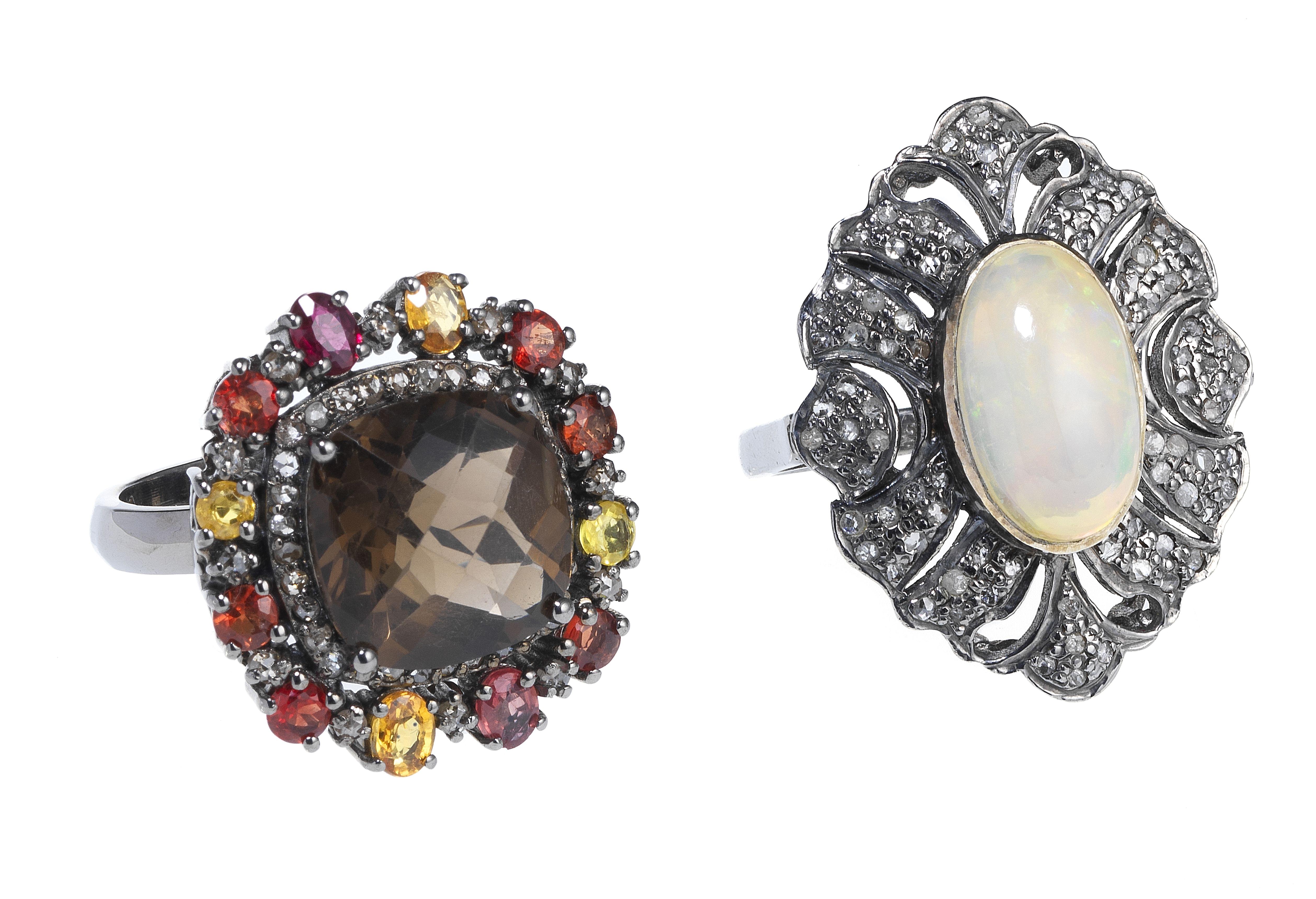 L'une centrée d'une opale taille cabochon ovale sur une monture ajourée pavée de roses de diamants, l'autre centrée d'un quartz fumé facetté entouré de saphirs de couleurs et de roses de diamants, argent noirci 925, doigt 55-15. Pour les lots précédés d'un *, la TVA de 7,7% est due sur l'entier du prix d'adjudication.