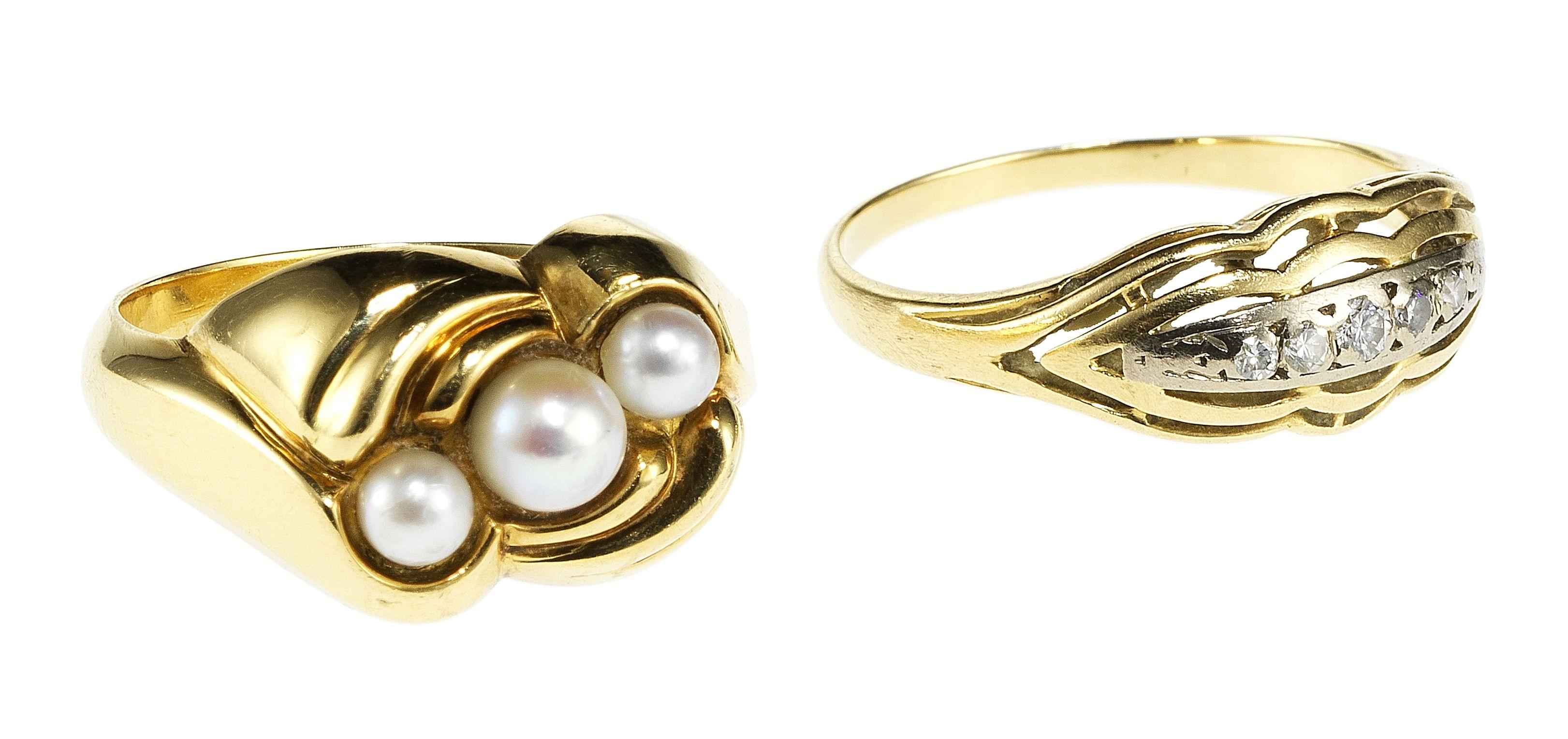3210. Lot de deux bagues, l'une sertie d'une ligne de roses de diamant, l'autre sertie de trois perles