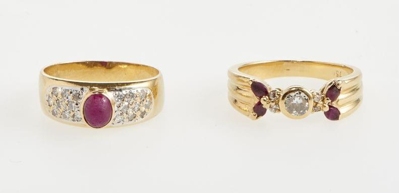 3237. Lot de deux bagues, l'une sertie d'un rubis en cabochon épaulé d'un pavage de diamants et l'autre sertie d'un diamant taille brillant épaulé de rubis et diamants
