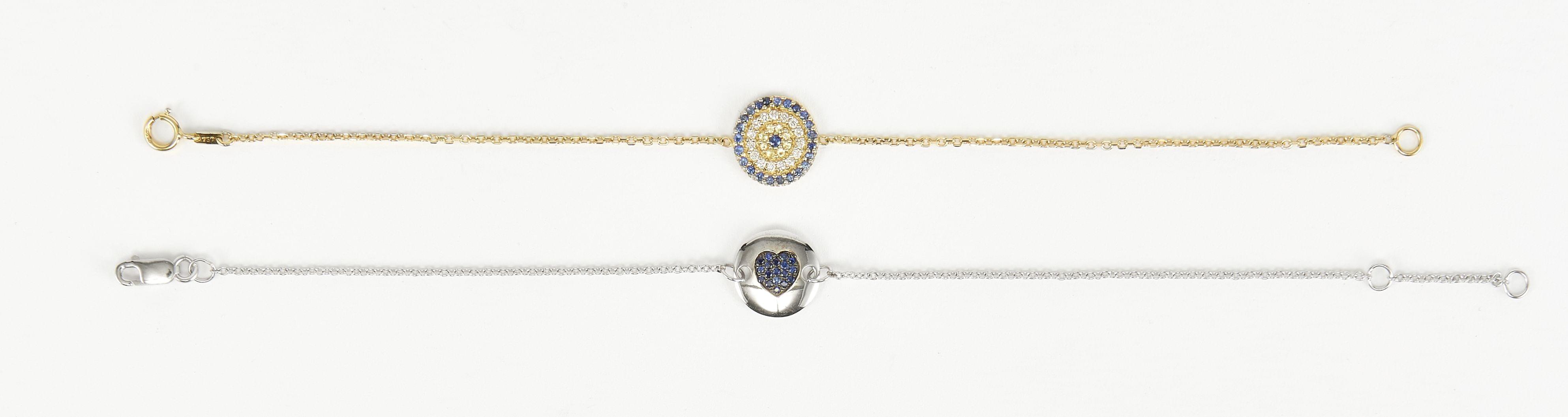 3144. Lot de deux bracelets, l'un retenant un motif rond pavé de diamants et de saphirs et l'autre retenant un motif de cœur pavé de saphirs