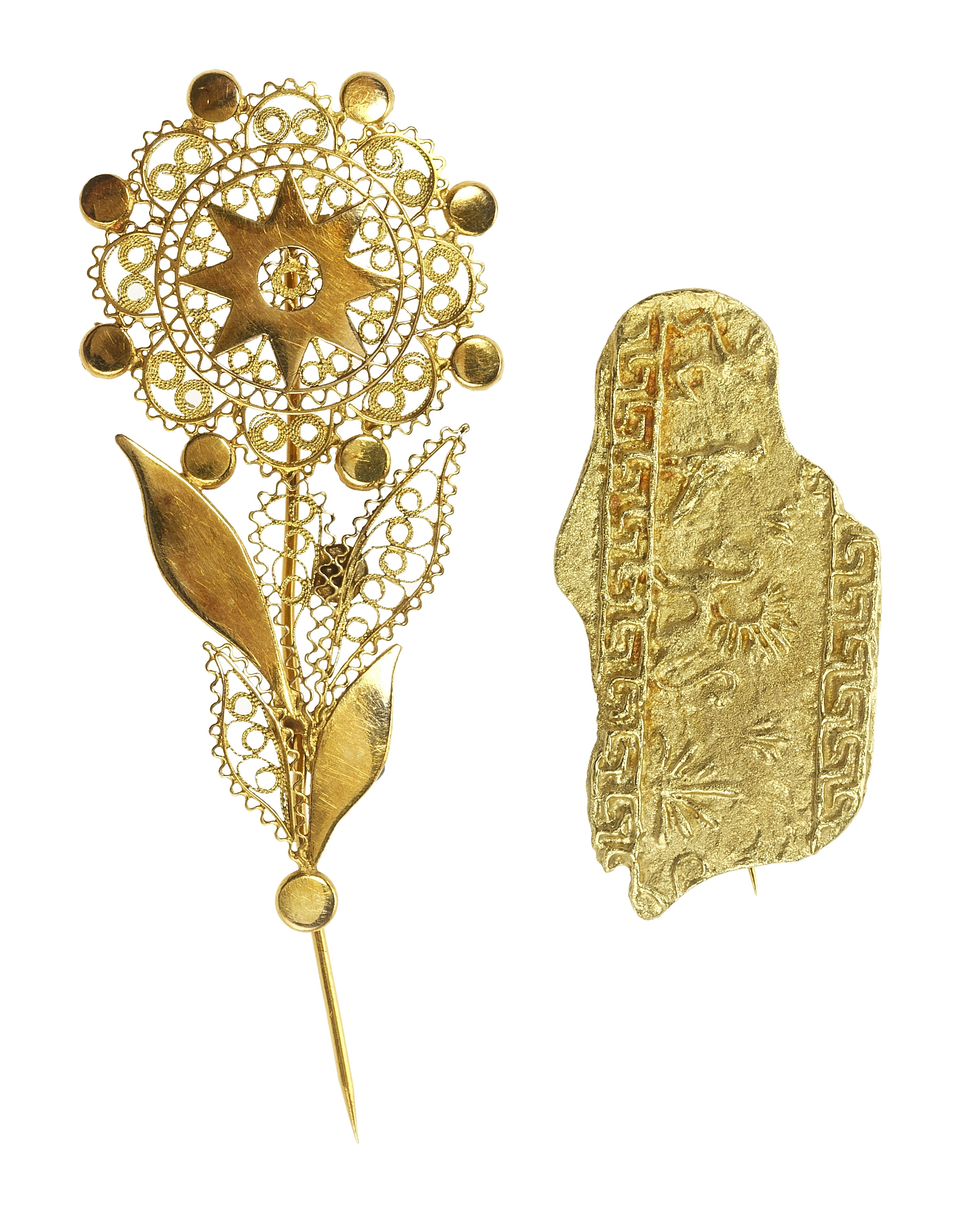 L'une à motif de scène antique et l'autre à motif de fleur filigranée, or 750, H entre 4 et 7 cm, 12 g