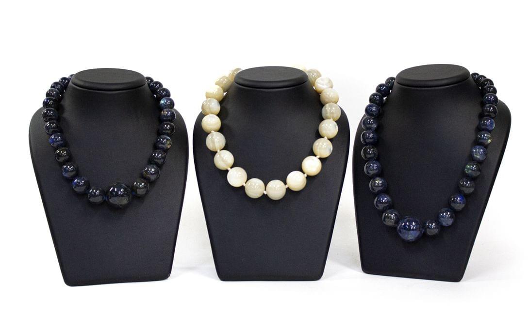 Fermoirs en argent 925, L 54 et 62 cm. On joint un collier de perles d'agate blanche, fermoir en métal, L 55 cm.