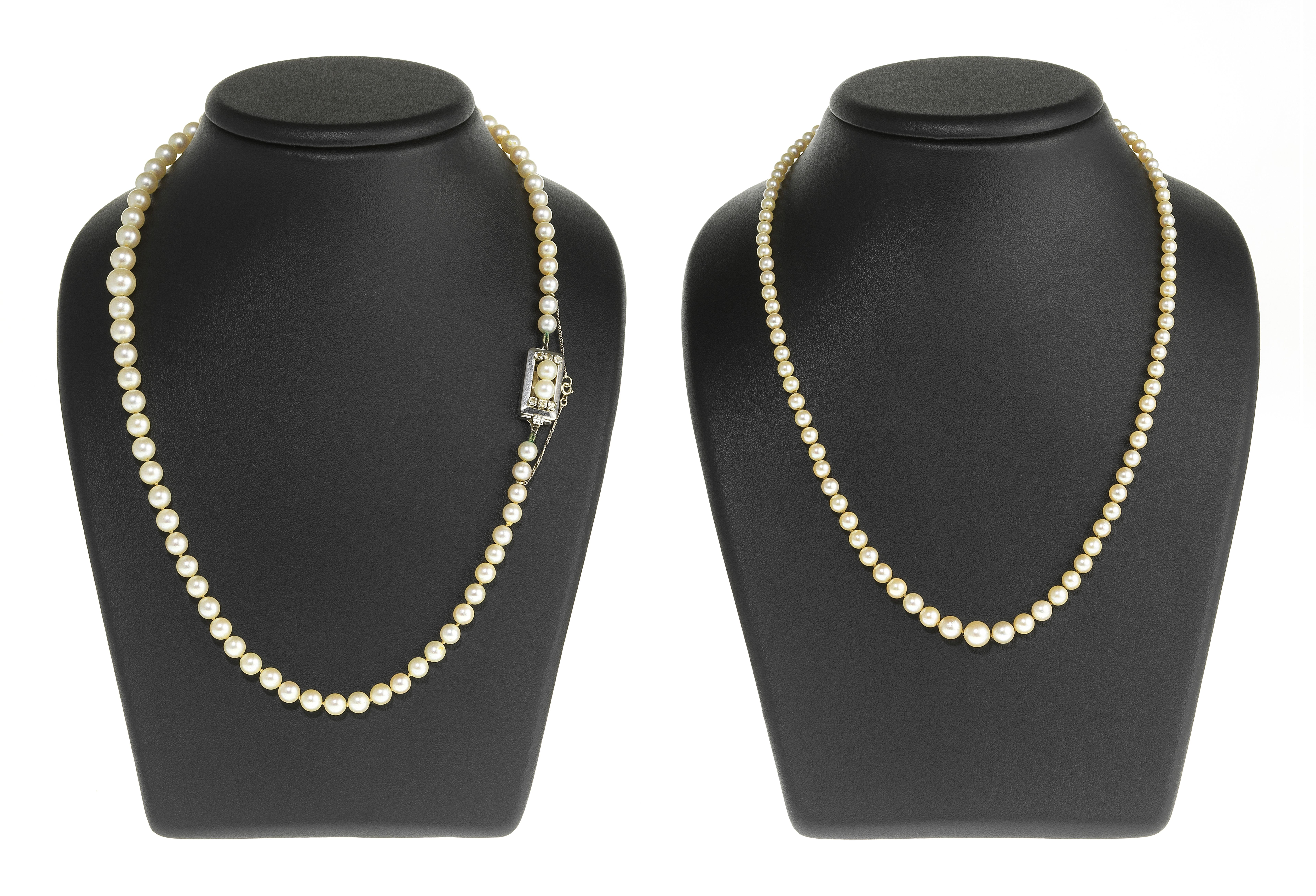 Fermoirs en or gris 750, l'un serti de six diamants taille ancienne, L 54 et 49 cm. Provenance: collection Marisa Perret-Rezzonico