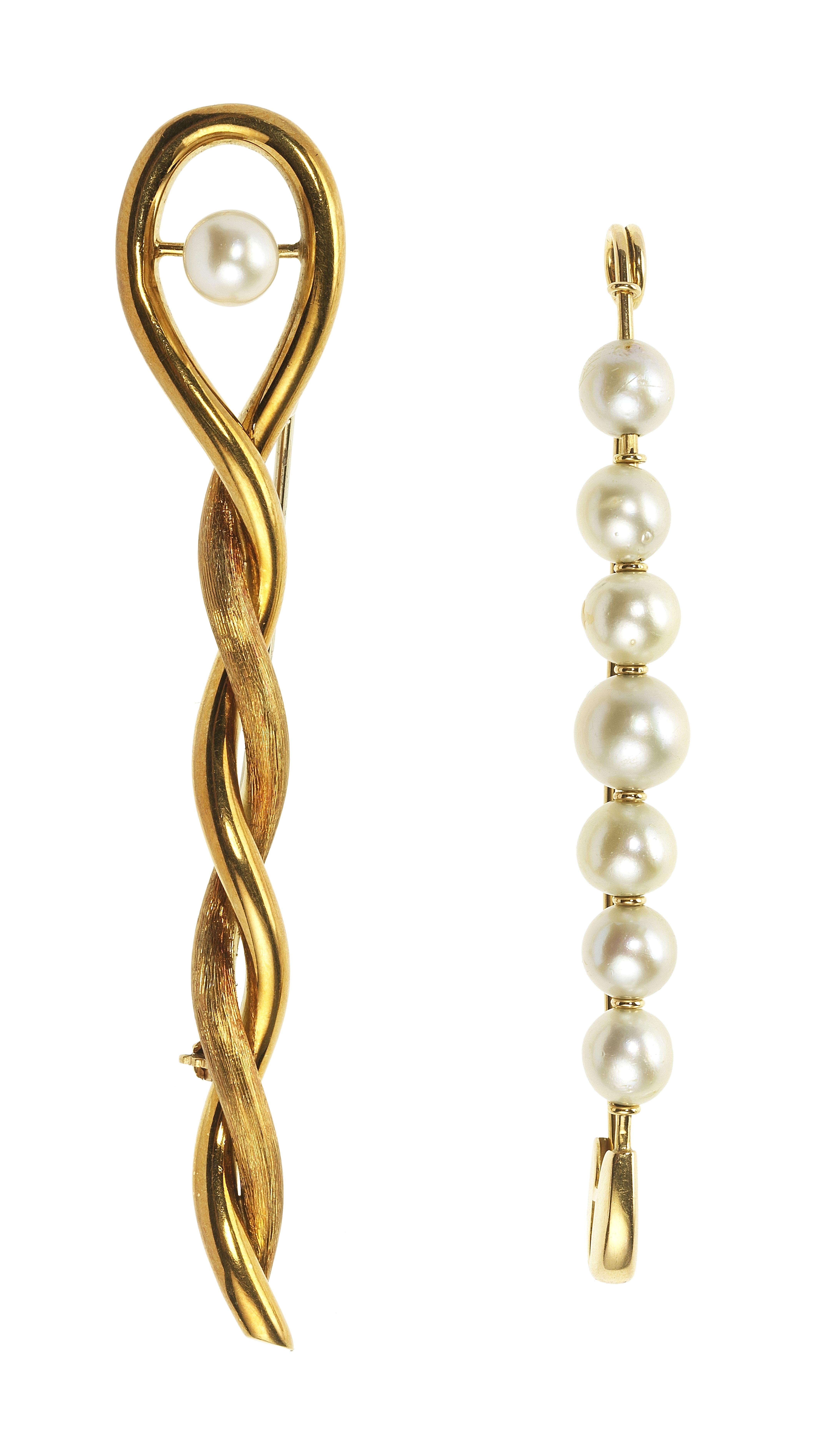 Une épingle à nourrice sertie de perles et une broche à motif torsadé serti d'une perle, or 750, H 8 cm, poids brut 17 g. Provenance: collection Marisa Perret-Rezzonico