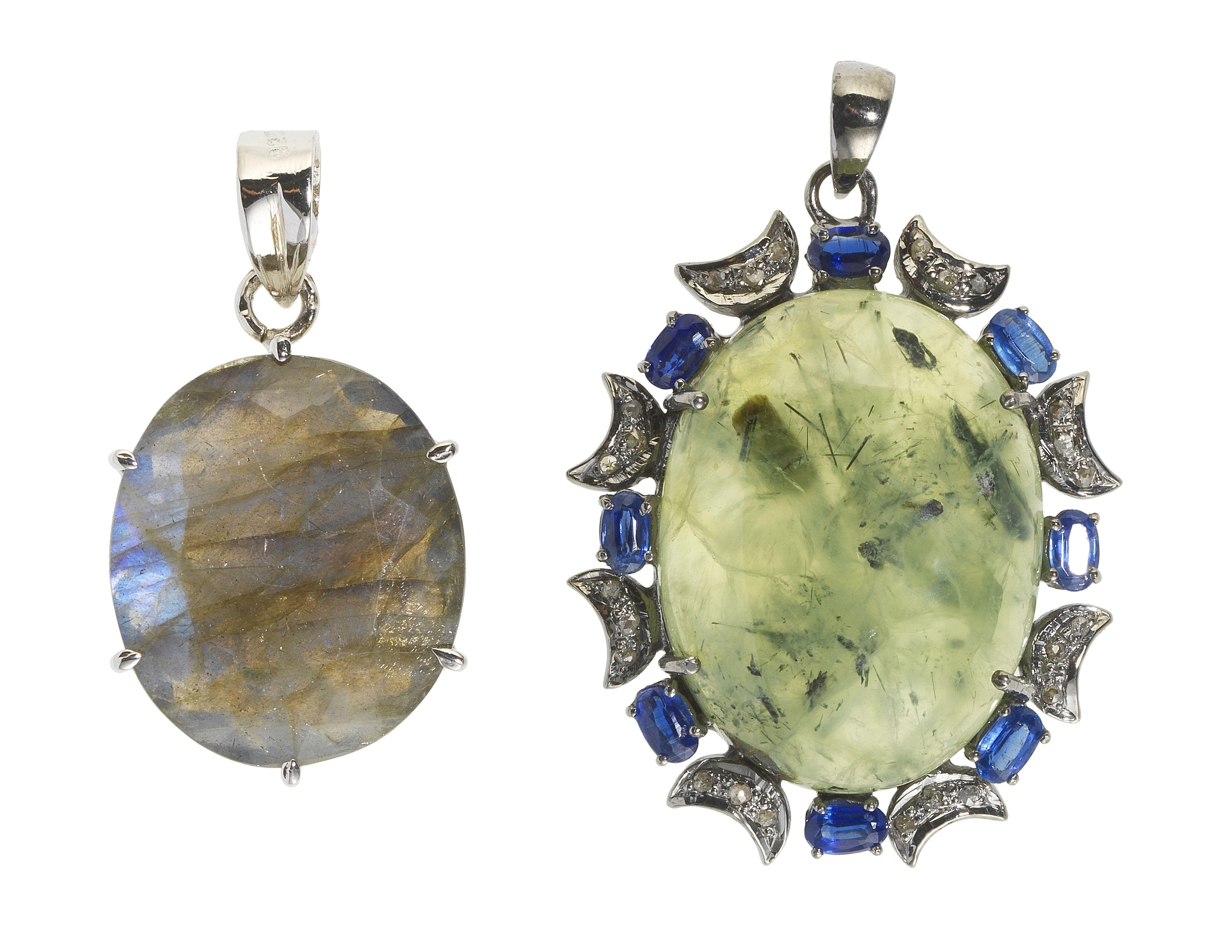 L'un serti d'une labradorite taille ovale et l'autre centré d'une agate taille cabochon ovale entourée de cyanites et de demi-Lune pavées de roses de diamant, argent 925, H 4 et 5 cm. Pour les lots précédés d'un *, la TVA de 7,7% est due sur l'entier du prix d'adjudication.