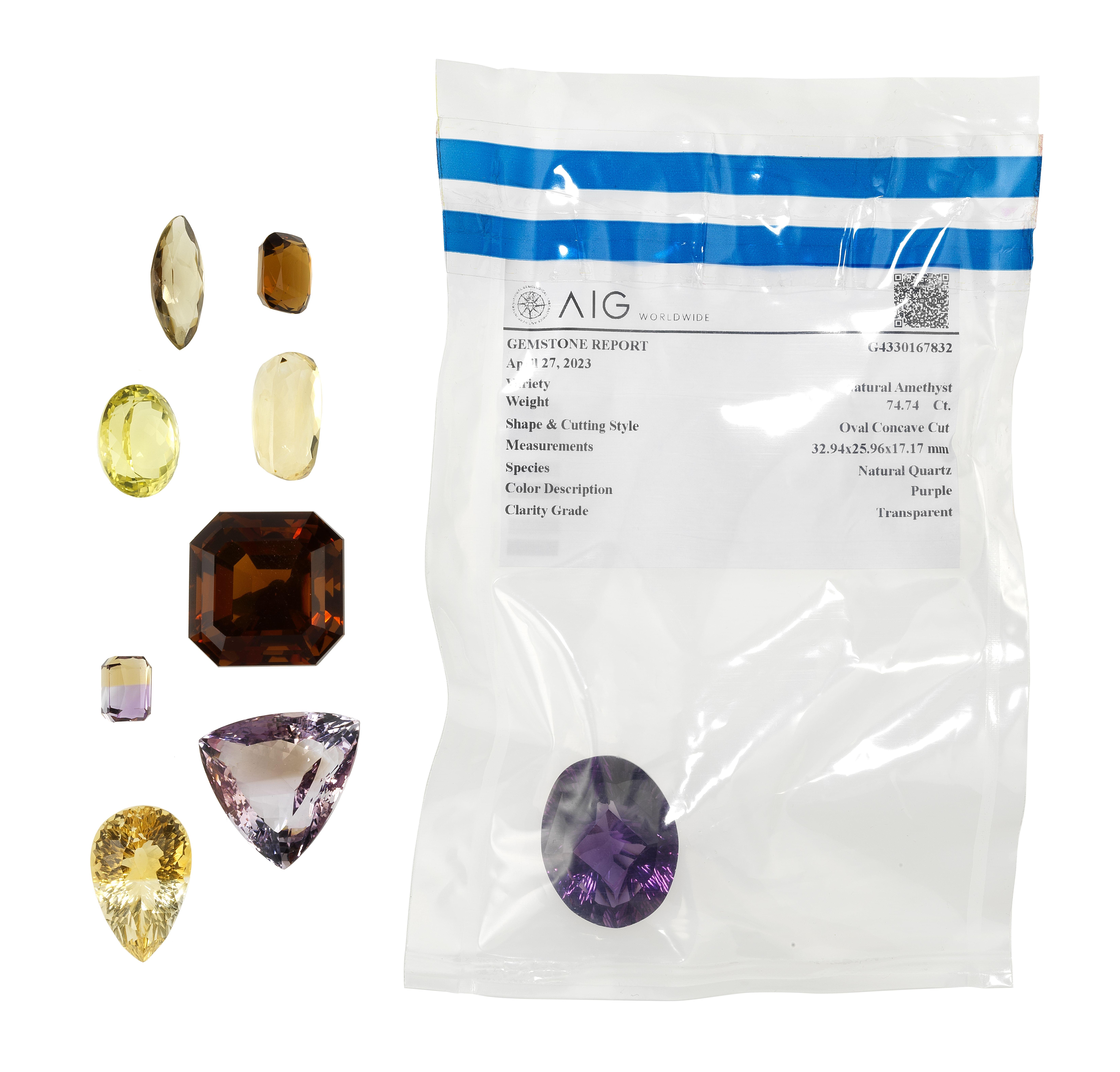 Une améthyste taille ovale (env. 74,74 ct), une améthyste taille troïda (env. 80 ct), une citrine octogonale (env. 133 ct), cinq citrines facettées (total env. 140 ct) et une amétrine taille rectangle (env. 9 ct), accompagnées de certificats GFCO et AIG. Pour les lots précédés d'un *, la TVA de 7,7% est due sur l'entier du prix d'adjudication.