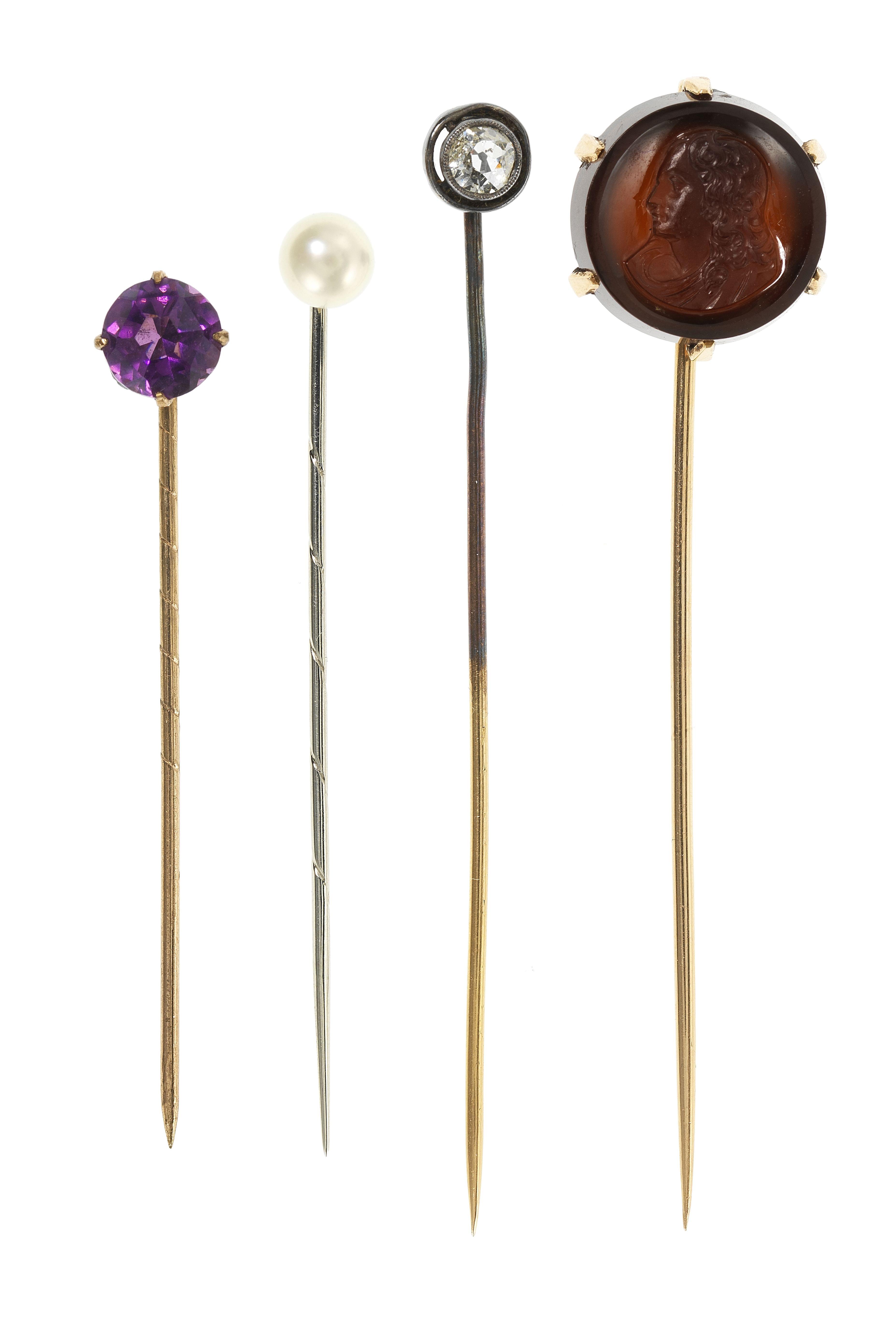 L'une retenant une sardoine sculptée à portrait d'homme, l'une sertie d'un diamant taille ancienne en serti clos (env. 0,2 ct), l'une sertie d'un verre d'imitation pour l'améthyste et l'une sertie d'une perle (D env. 5,5 mm), or 750, or gris 585, or bas titre et argent, H entre 5 et 7 cm, poids brut 7 g