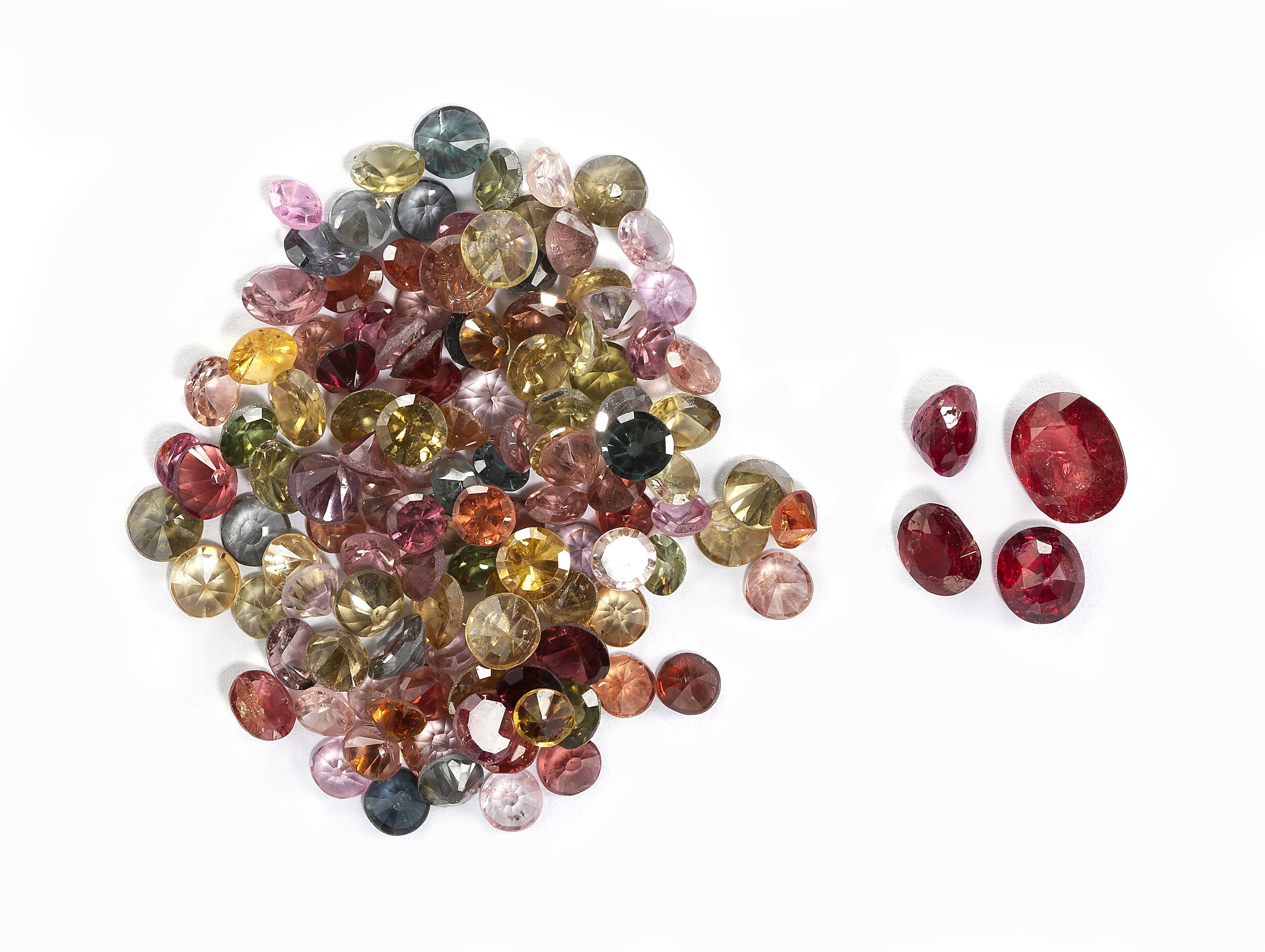 3464. *Lot de quatre spinelles rouges birmans non chauffés et de spinelles multicolores sur papier