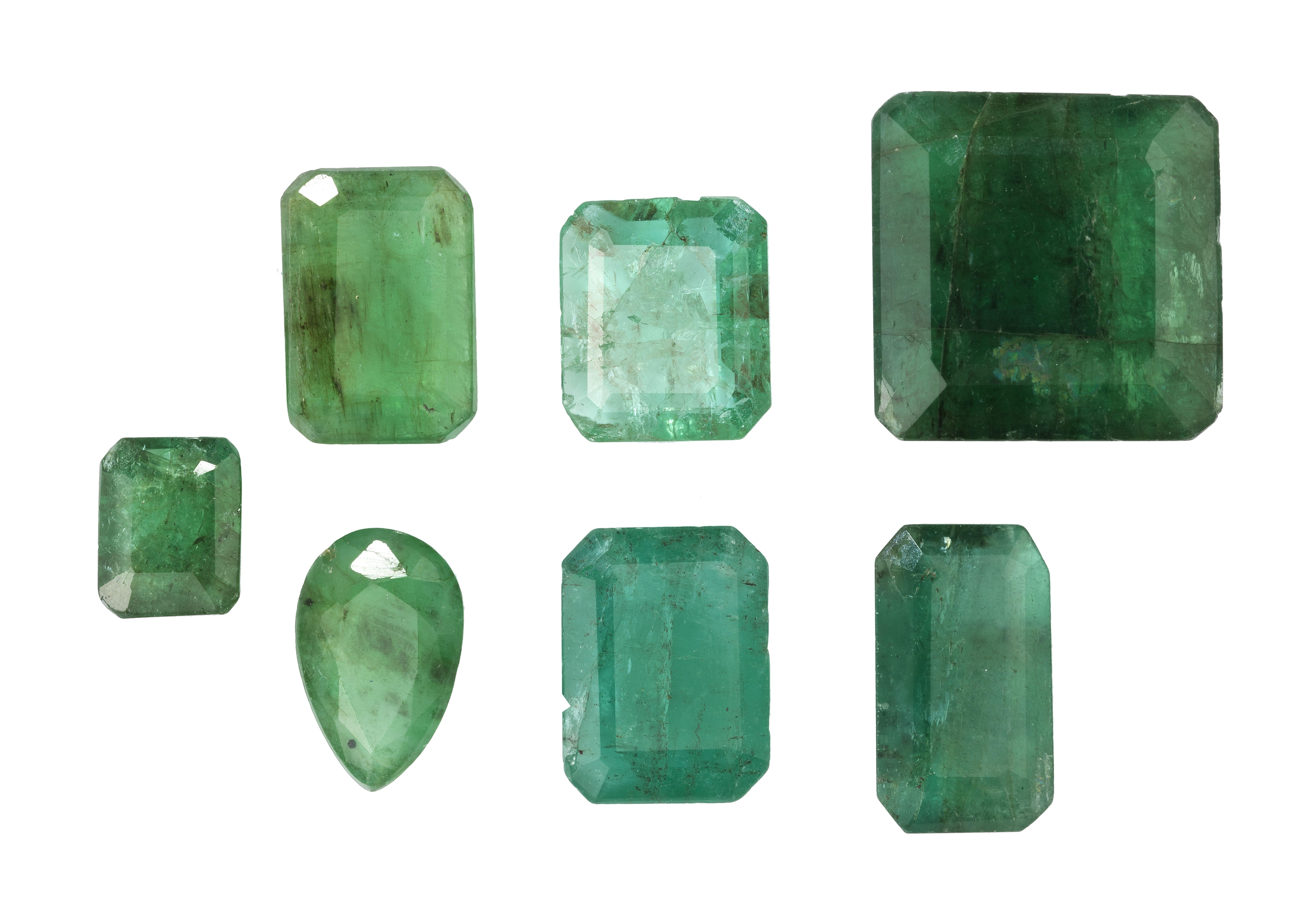 107. Broche-pendentif ajourée à décor de volutes, sertie d'émeraudes...