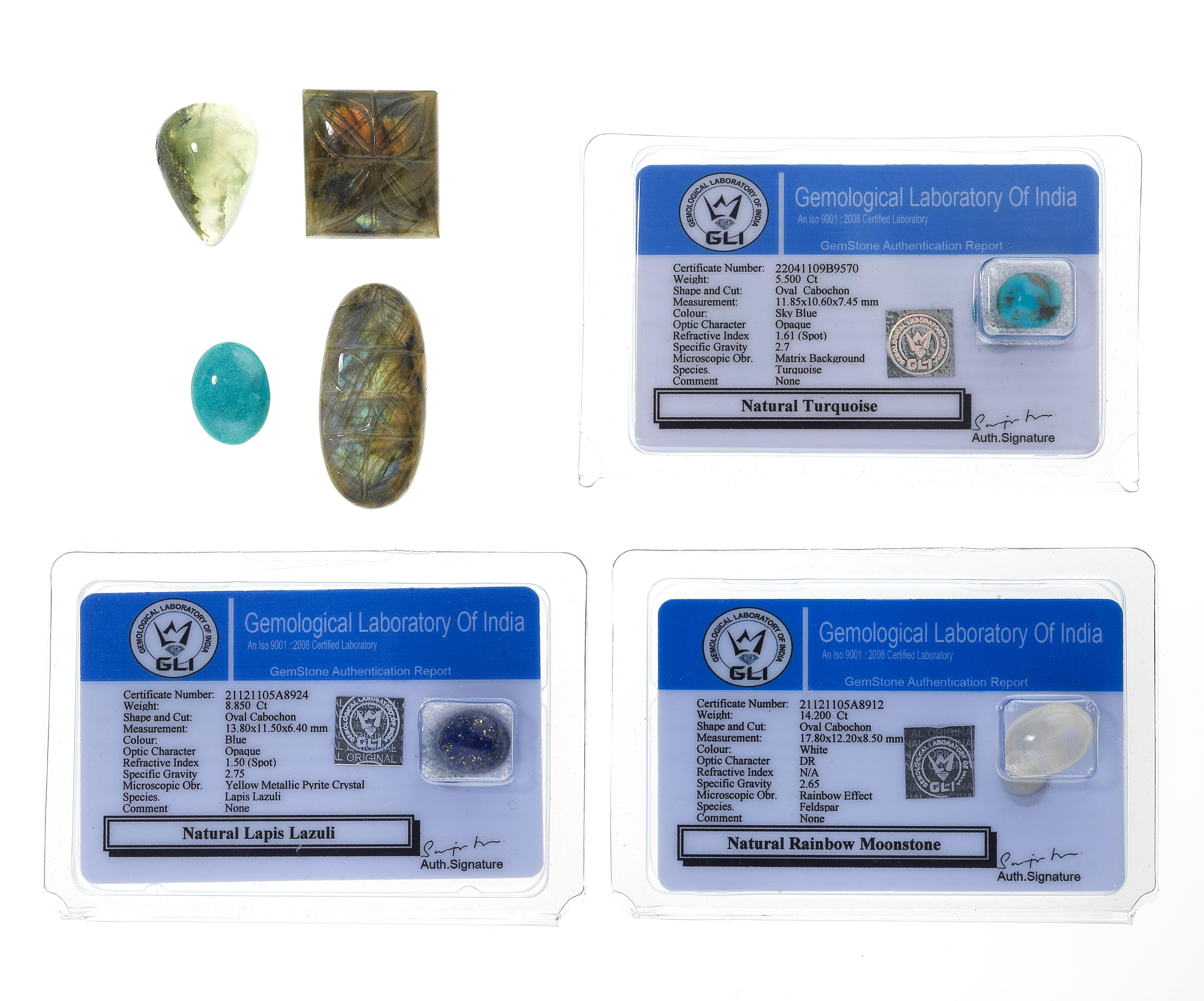 Une pierre de Lune taille cabochon (14,2 ct), deux labradorites sculptées à motif floral (56,45 et 64,70 ct), un lapis-lazuli taille cabochon (8,85 ct), une prehnite taille cabochon poire (32,80 ct), une turquoise taille cabochon (5,50 ct), et une turquoise taille cabochon ovale (15,89 ct), accompagnées de certificats. Pour les lots précédés d'un *, la TVA de 7,7% est due sur l'entier du prix d'adjudication.