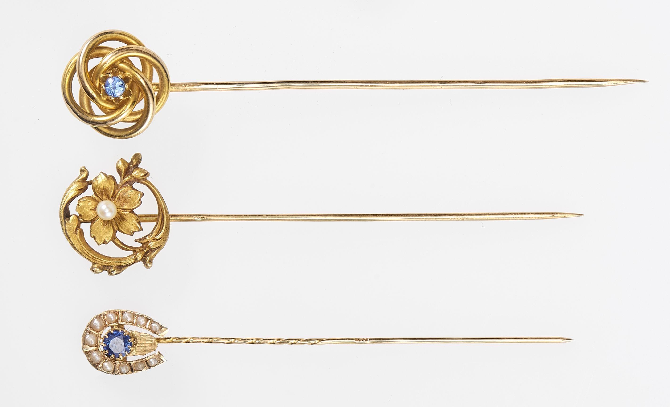 L'une Art nouveau à décor floral centré d'une perle, l'une à motif de fer à cheval centré d'un saphir entouré de demi-perles, la dernière à motif d'entrelac centré d'un saphir