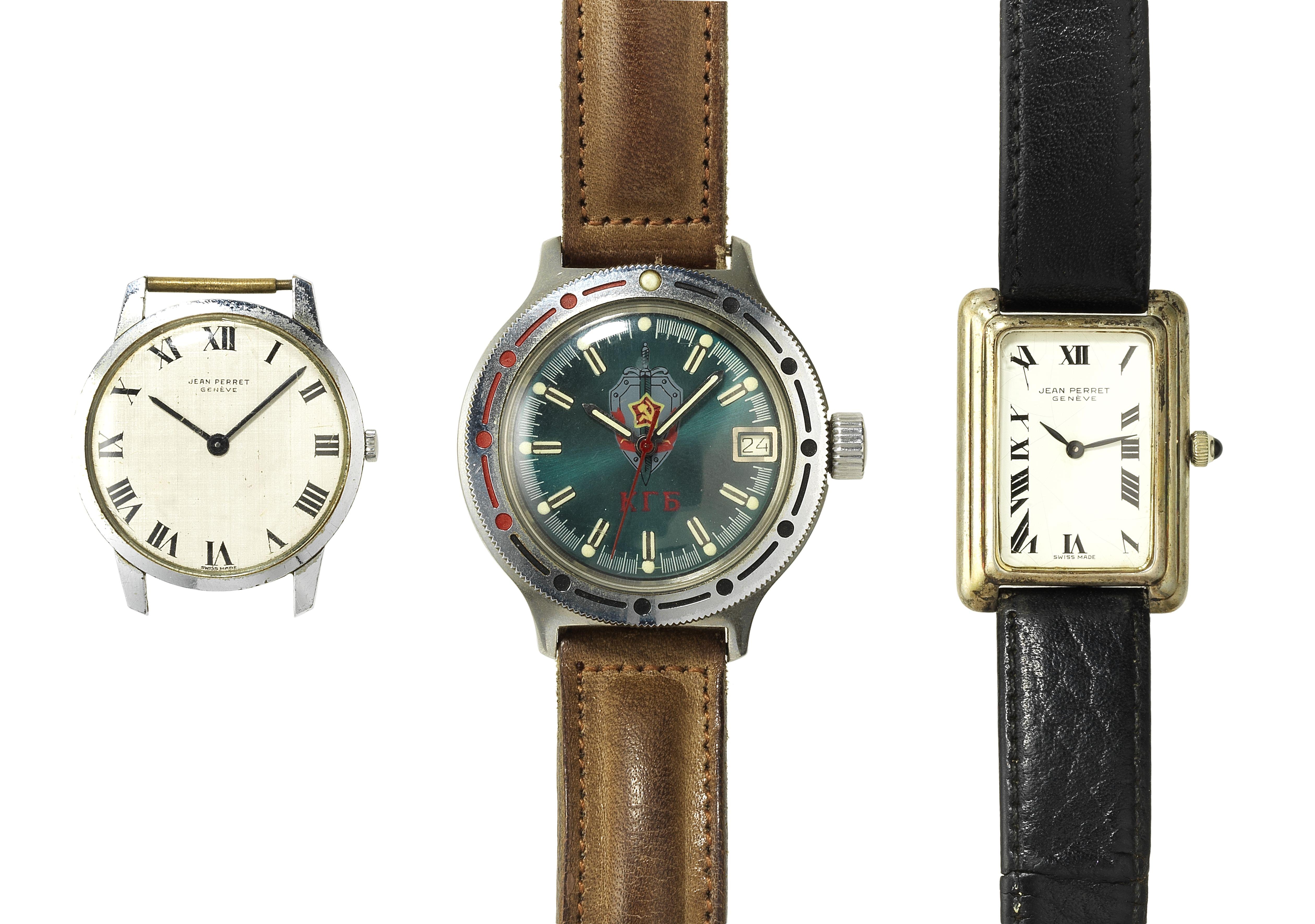 Vostok, montre ronde automatique, Jean Perret, montre rectangulaire mécanique et Jean Perret, montre ronde mécanique, acier, D 38 et 31 mm, 35x25 mm