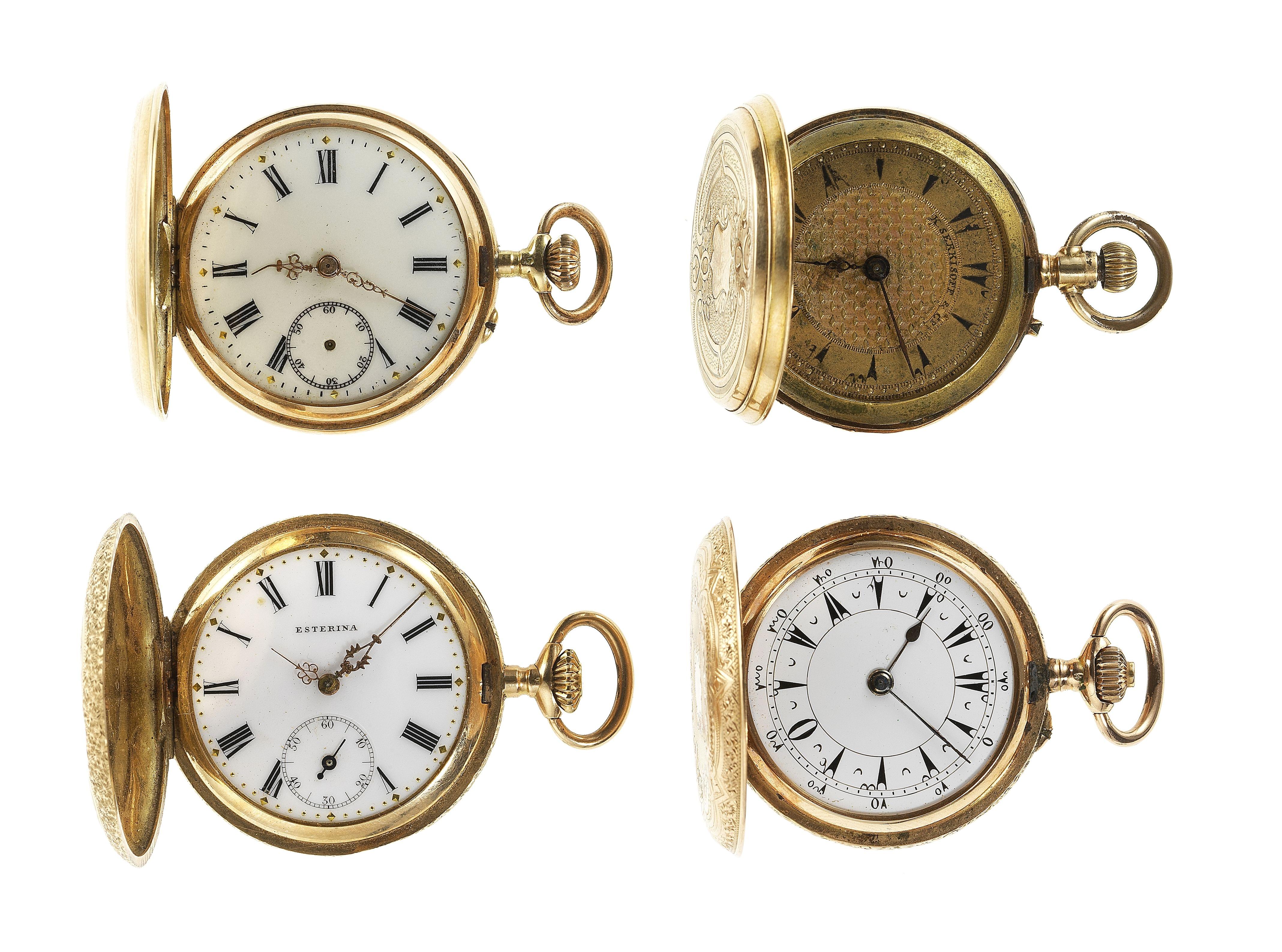 L'une pour le marché turc, l'une signée Esterina, cadrans émaillés blancs, aiguilles dorées et chiffres turcs ou romains noirs, or 585, D 33 mm, poids brut 88 g, manque les verres de montres. On joint une montre de poche pour le marché turc à réparer, or 585, D 32 mm, poids brut 28 g