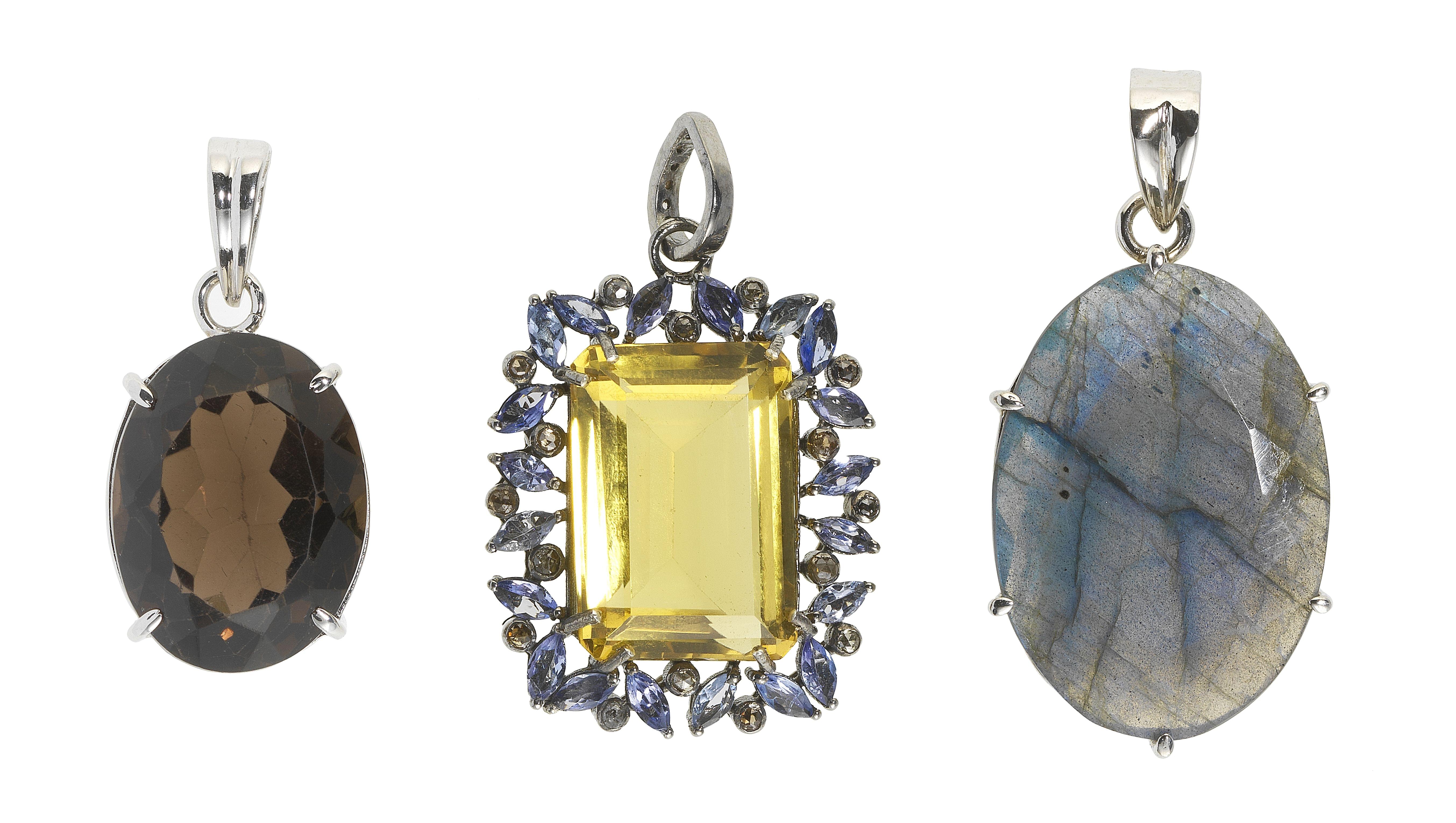 Le premier serti d'une citrine taille émeraude entourée de tanzanites et de roses de diamant, le deuxième serti d'une labradorite taille ovale et le troisième serti d'un quartz fumé taille ovale, argent 925, H entre 3,5 et 4,5 cm. Pour les lots précédés d'un *, la TVA de 7,7% est due sur l'entier du prix d'adjudication.