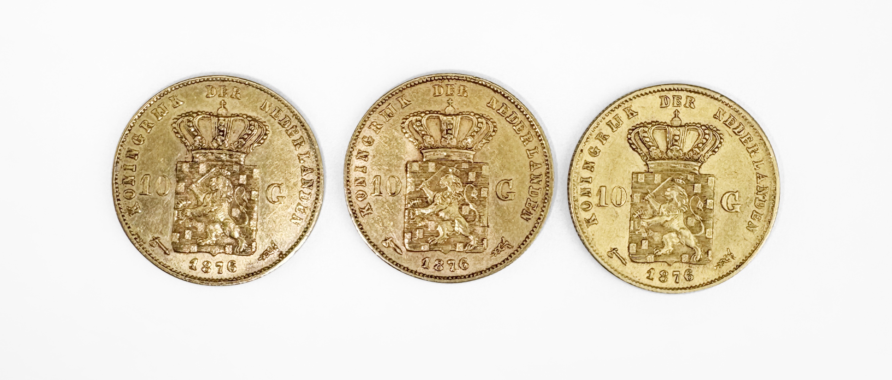 4750. Lot de trois pièces de 10 florins des Pays-Bas