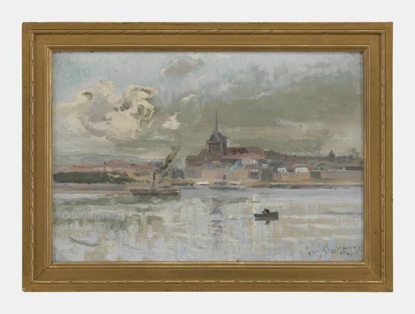 Cœur du jour dans le port de Genève, huile sur toile, signée, datée au dos 1925, 24x34 cm