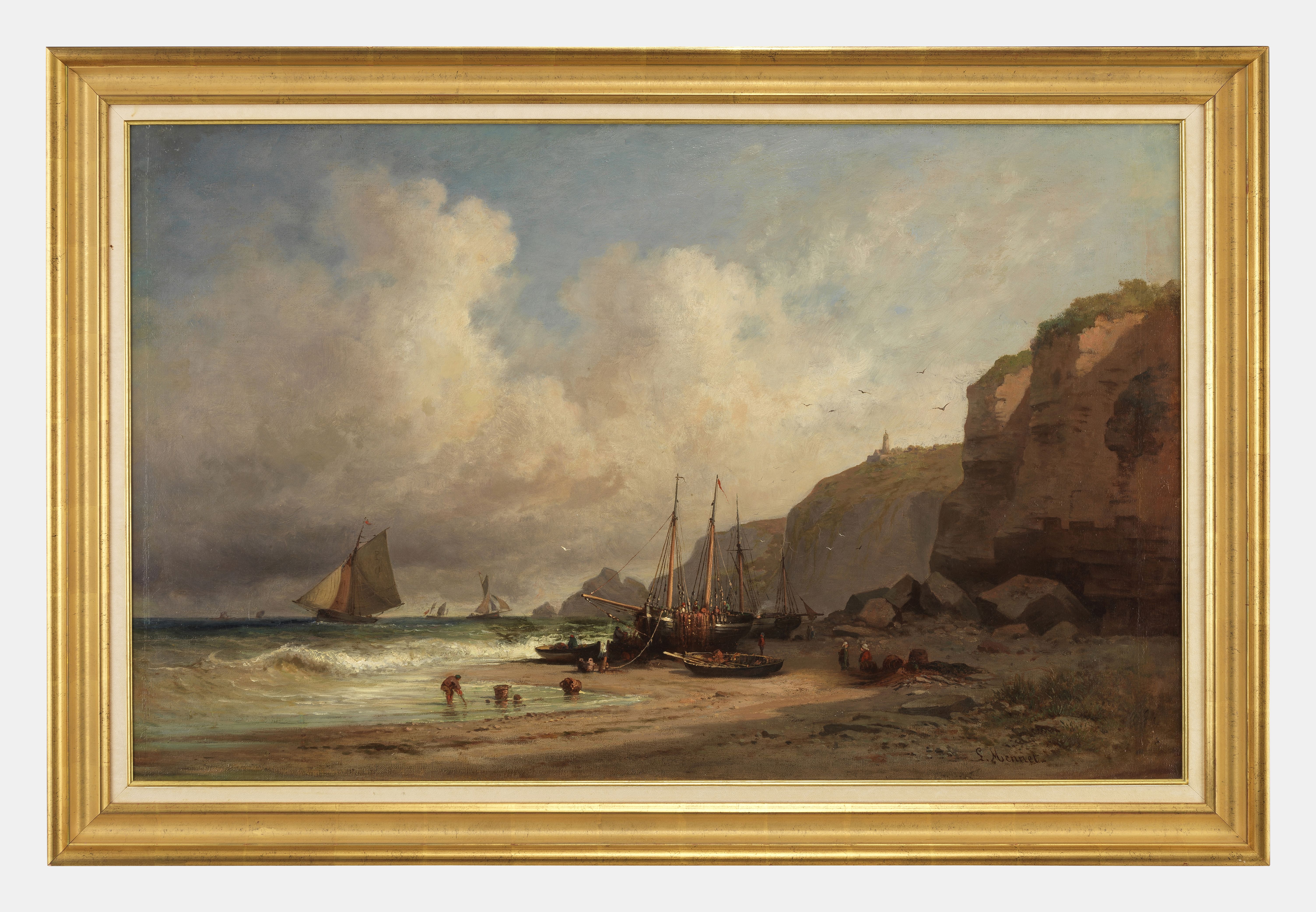 Voilier sur la plage, huile sur toile, signée, 60x93 cm