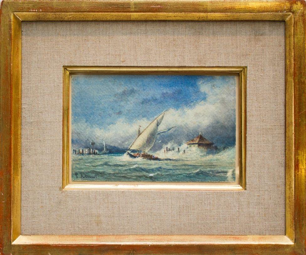 Barque type Neptune en rade de Genève, aquarelle sur papier signée, 13x20 cm