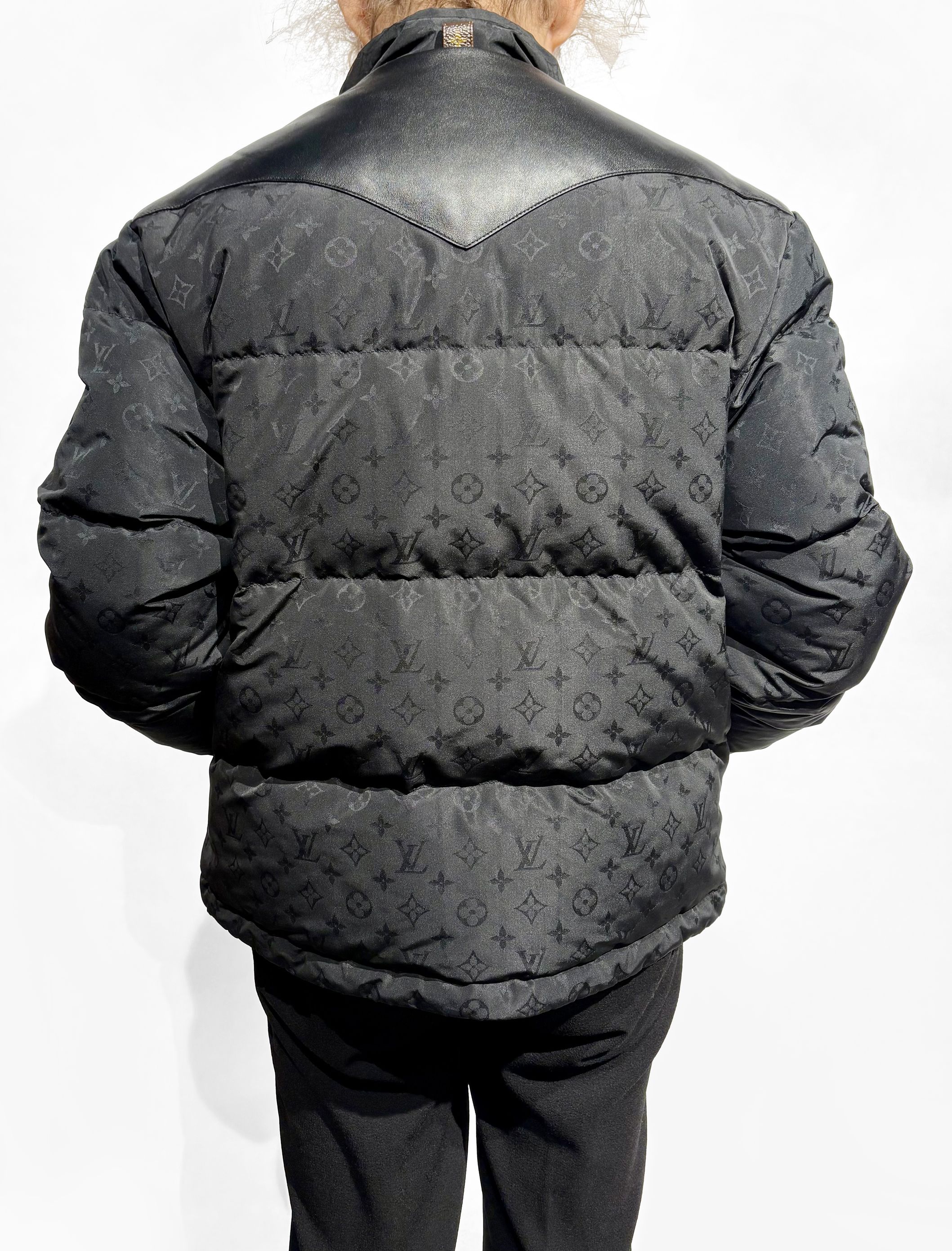 Tissu noir monogrammé, cuir noir, fermetures éclair, poches latérales, T 38