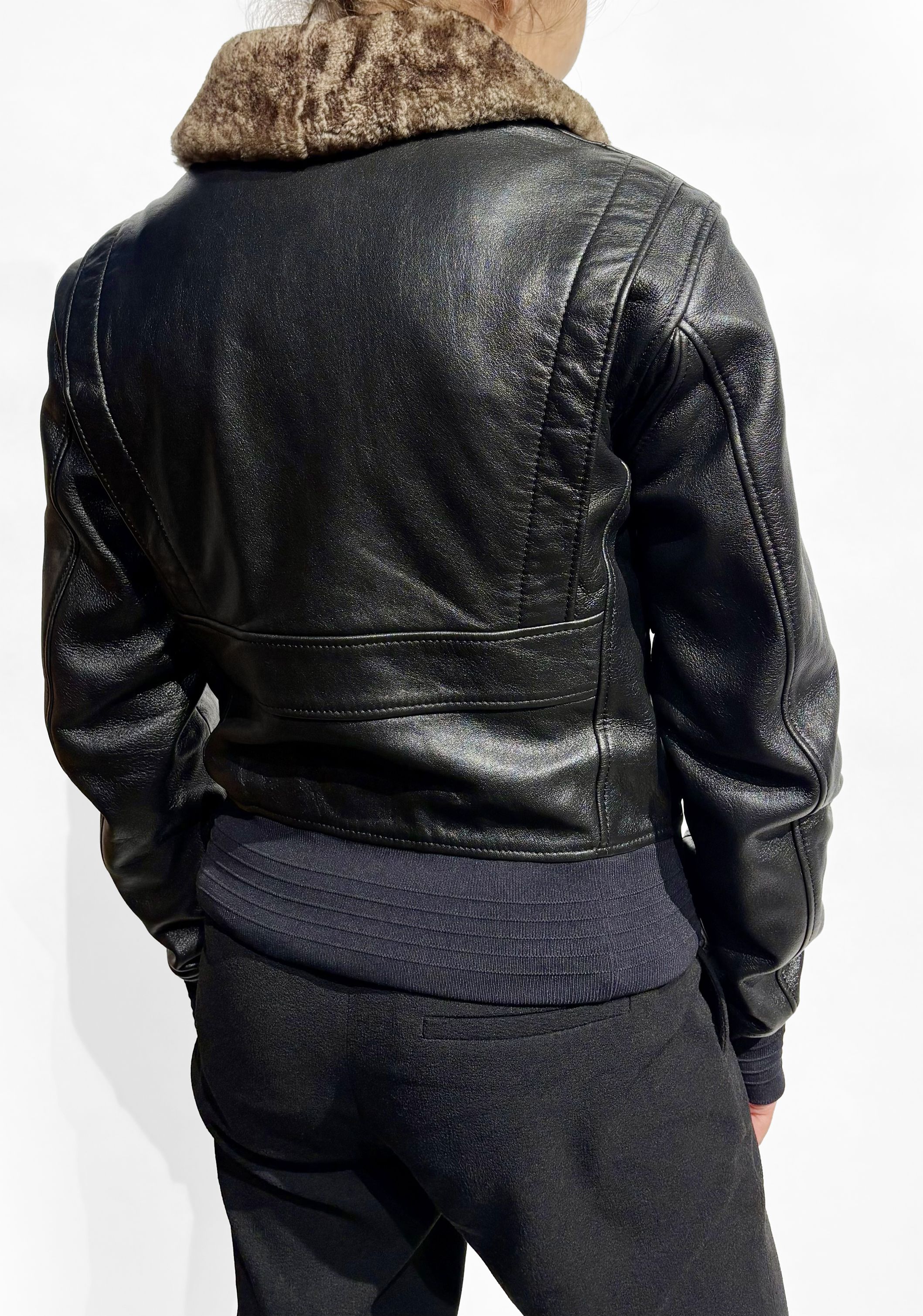 Cuir noir, col en shearling, poches plaquées, finitions en bord-côte aux poignets et à la base, fermeture éclair, T 36