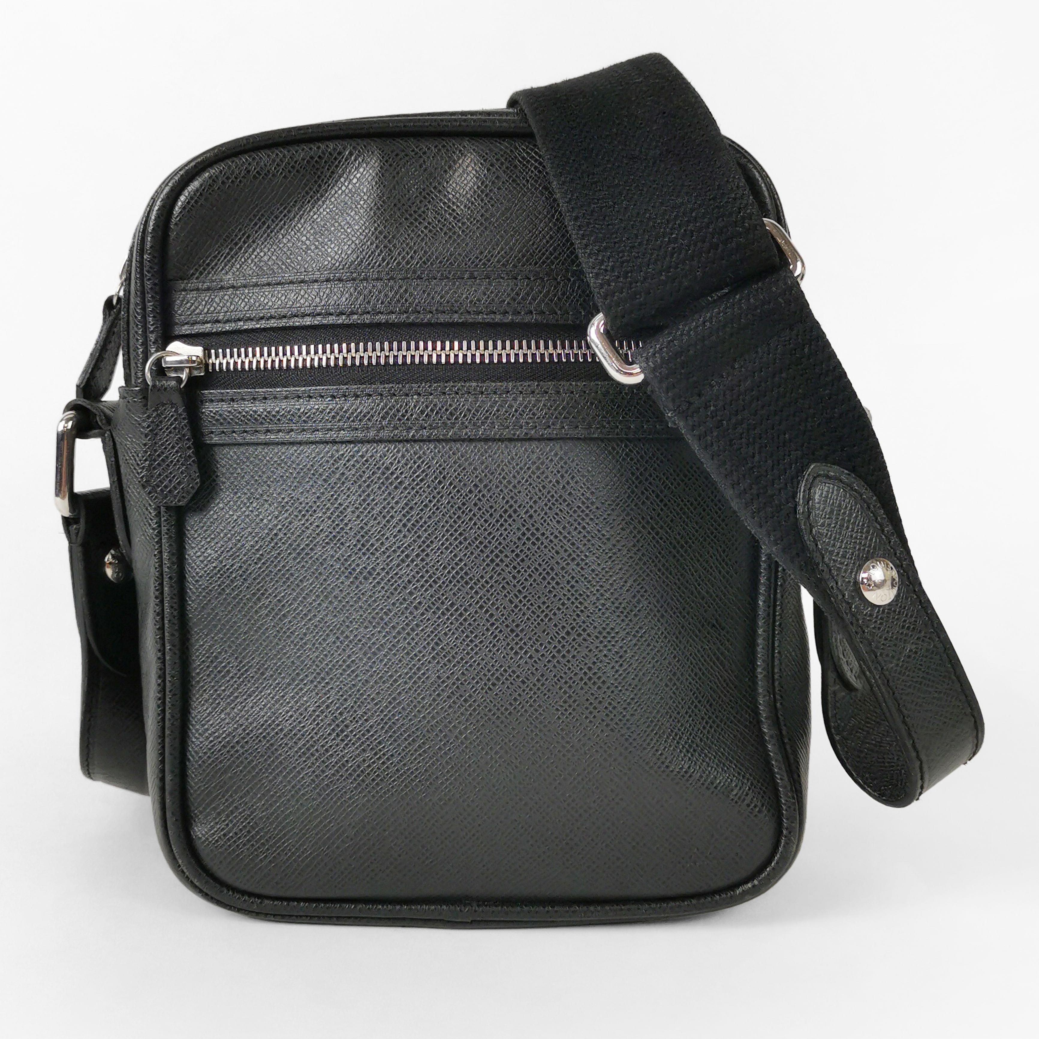 Cuir grainé anthracite, poches latérales à soufflet, zippée, bandoulière ajustable, garniture en métal argenté, 23x18x6 cm