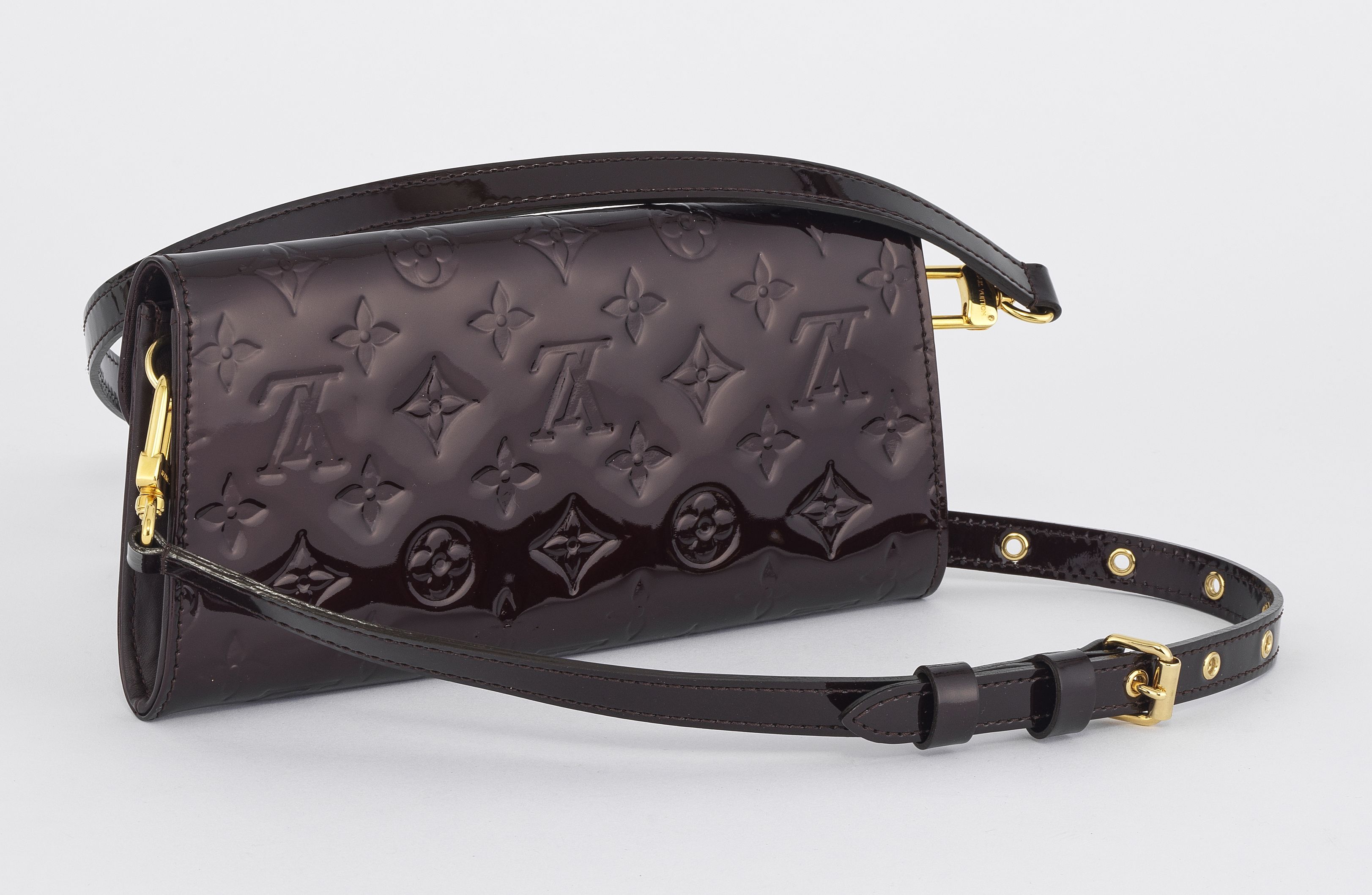 Cuir verni bordeaux, garniture en métal doré, anses détachables pour porté main ou épaule, 11x24x2,5 cm. On joint un porte-monnaie Louis Vuitton en toile enduite monogrammée, 9x6,5 cm.