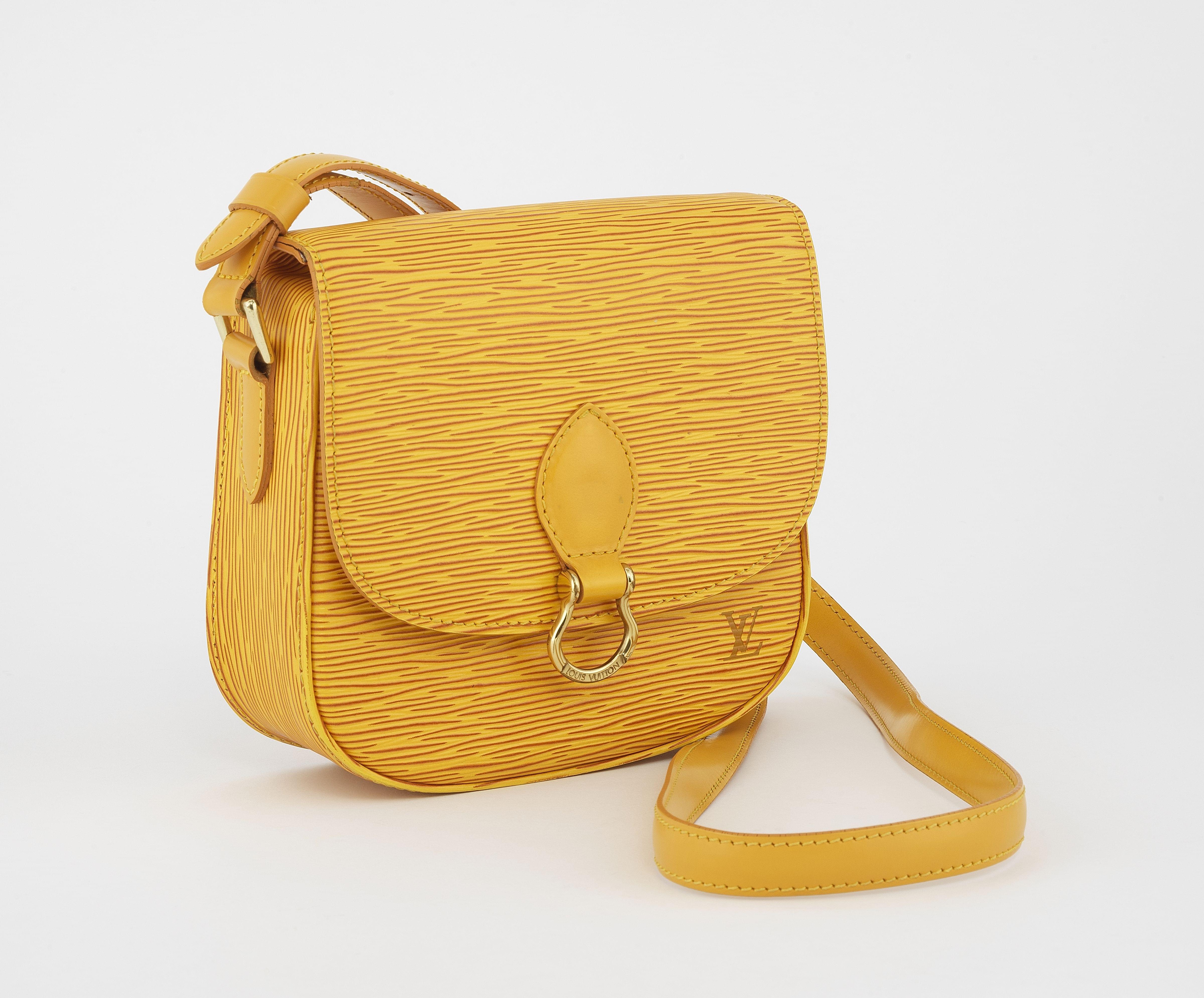 Cuir Epi jaune, fermeture en rabat à pression, intérieur en cuir, bandoulière ajustable, 16x18x6 cm. Provenance : collection Marisa Perret-Rezzonico