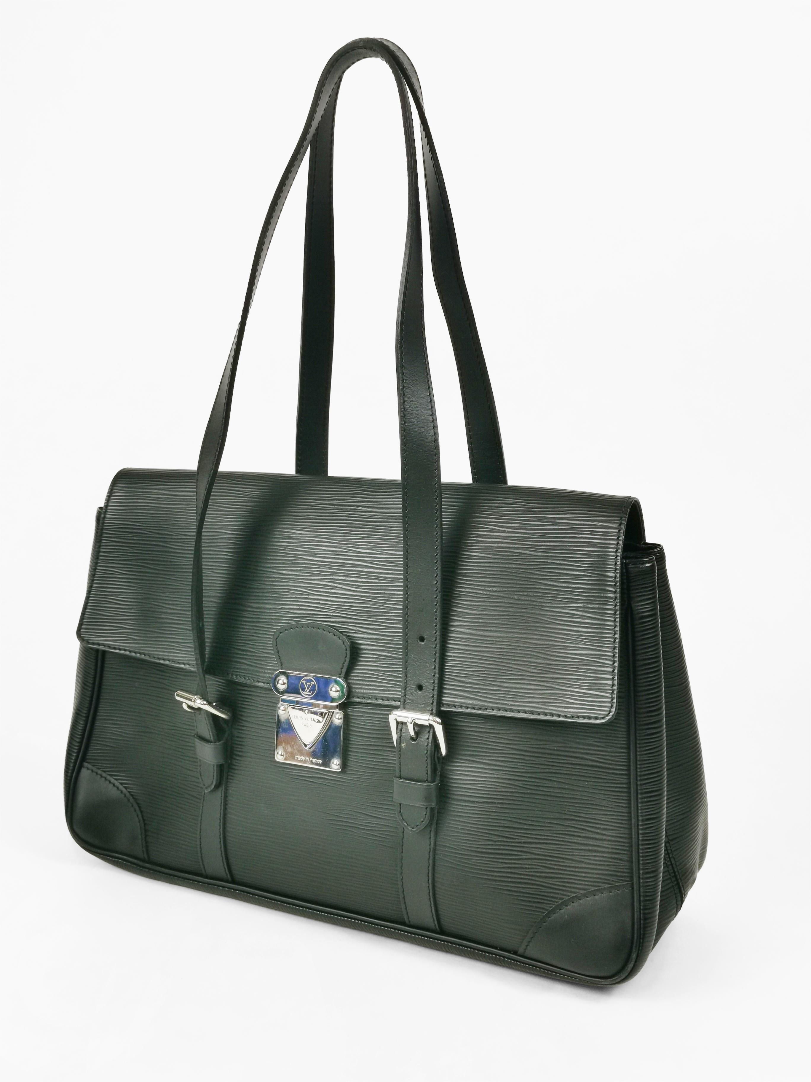 Cuir Epi noir, double poignée, fermeture sur rabat et bouton pression, 37x23x12 cm