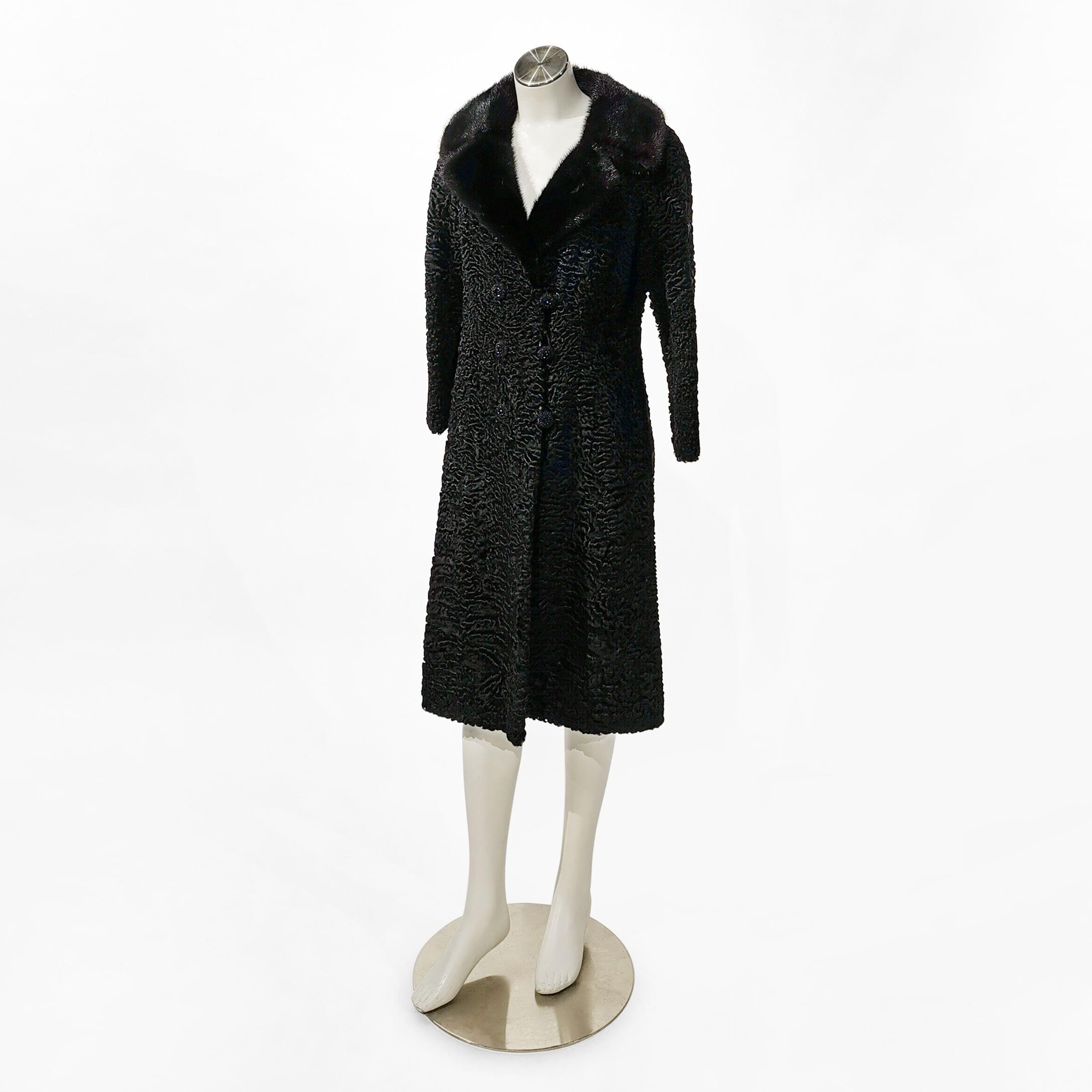 Astrakan noir, col en vison, intérieur en soie noire, fermeture à boutons perlés, sans poche