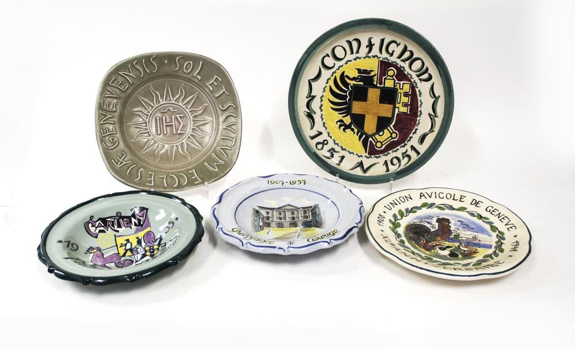 Ensemble de cinq plats commémoratifs de Genève de 1948 à 1957, D de 26 a 30 cm
