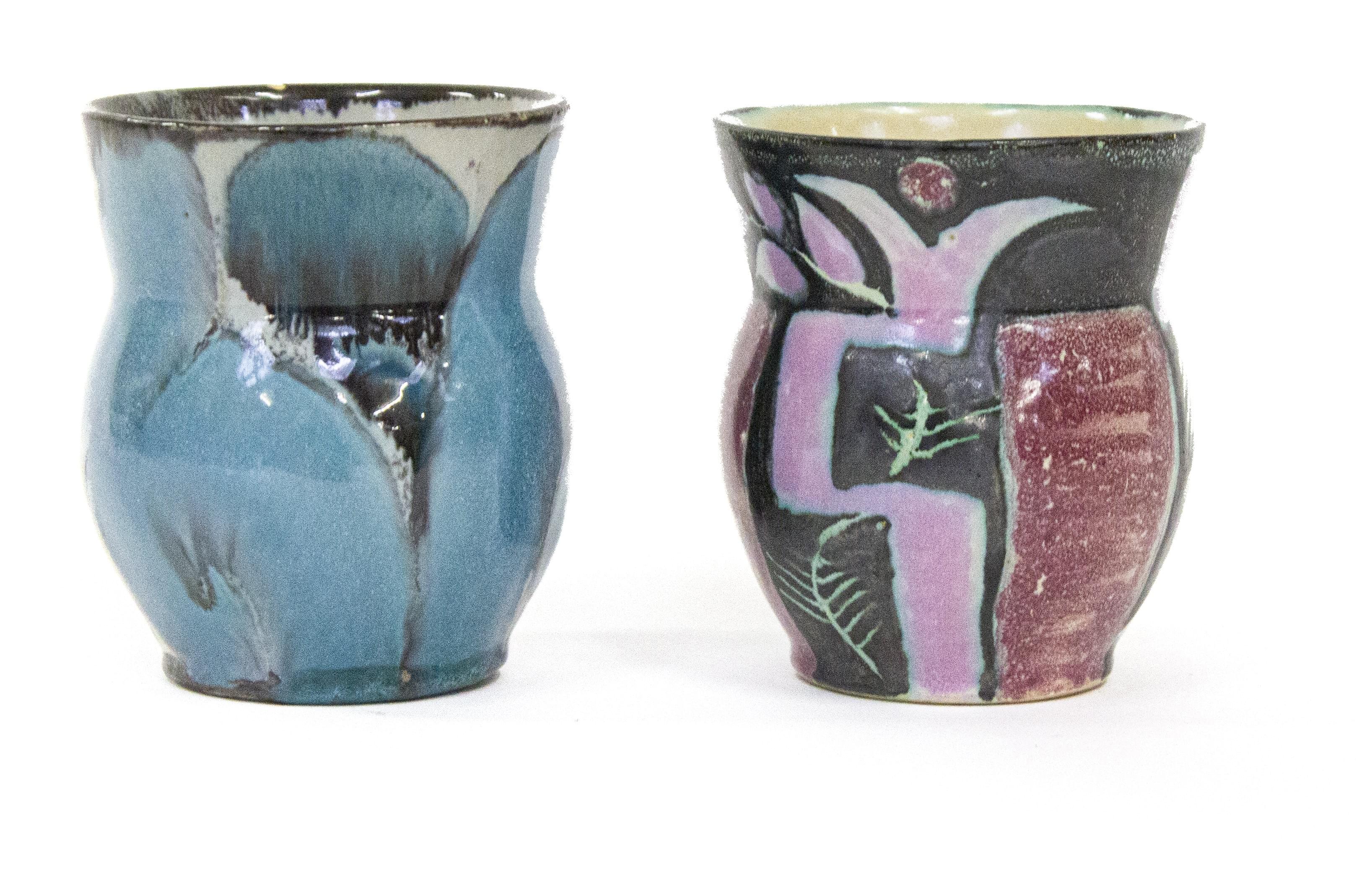 Deux vases évasés à décor abstrait et de marbrures, céramique émaillée, Poterie de La Chapelle, H 9 cm