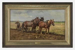 Charrue tractée par les chevaux, huile sur toile, 38x69 cm