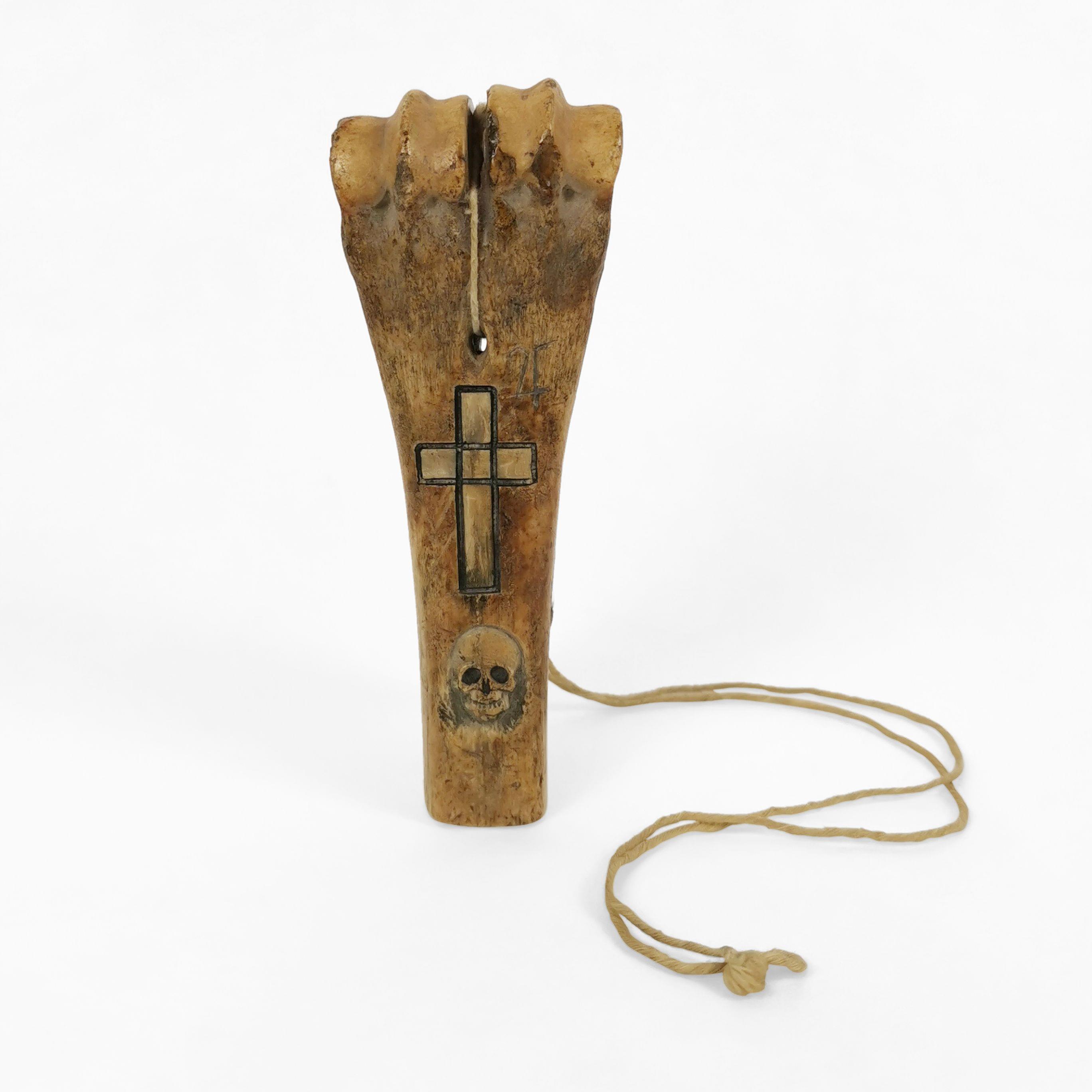 Os à décor gravé d'une tête de mort, H 13 cm