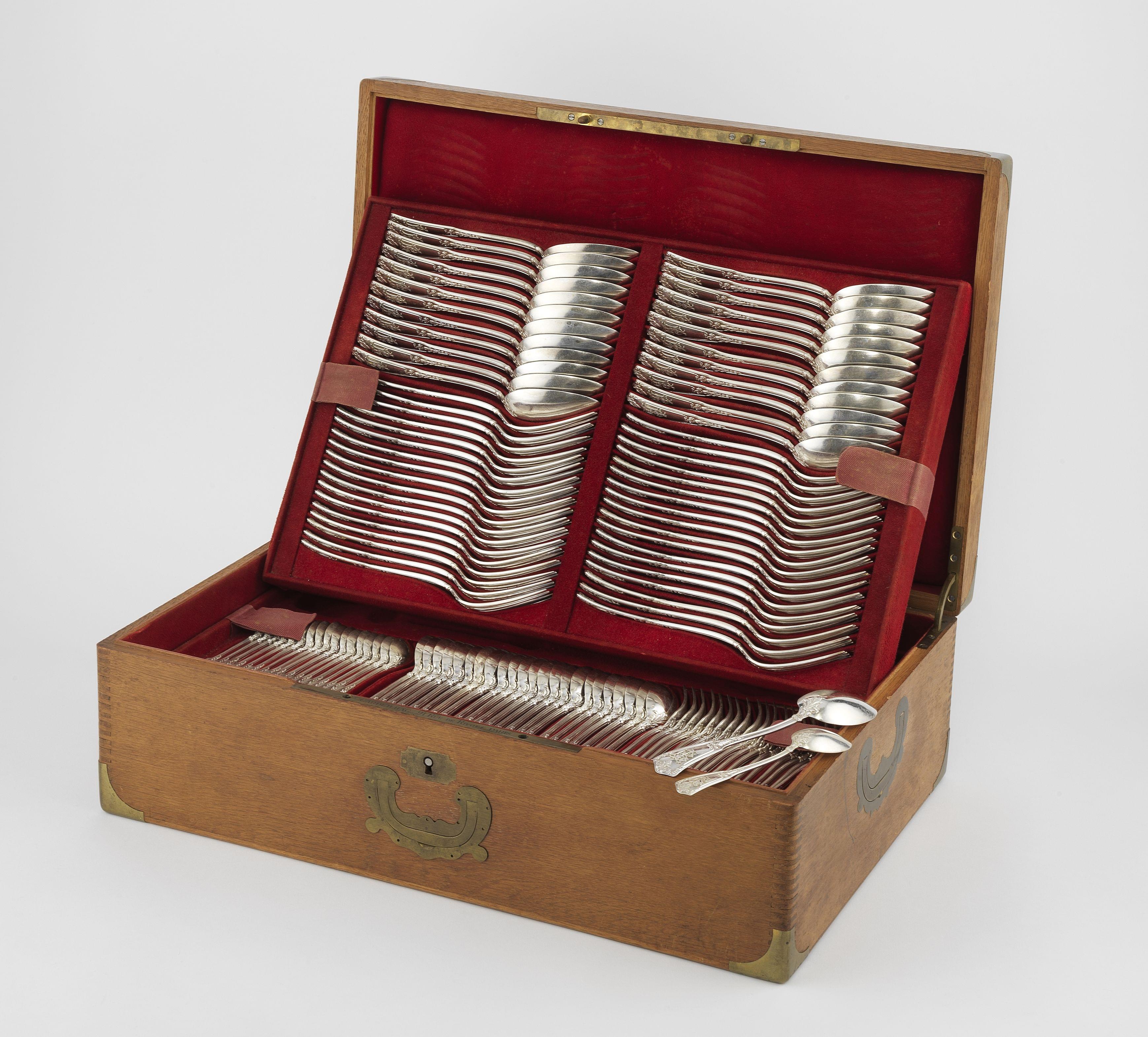 Henri Louis Chenailler, Paris, deuxième moitié du XIXe s, argent, comprenant: 36 fourchettes et 24 cuillères à dîner, 18 fourchettes et 24 cuillères à entremets, 18 cuillères à thé, 1 louche, 7900 g