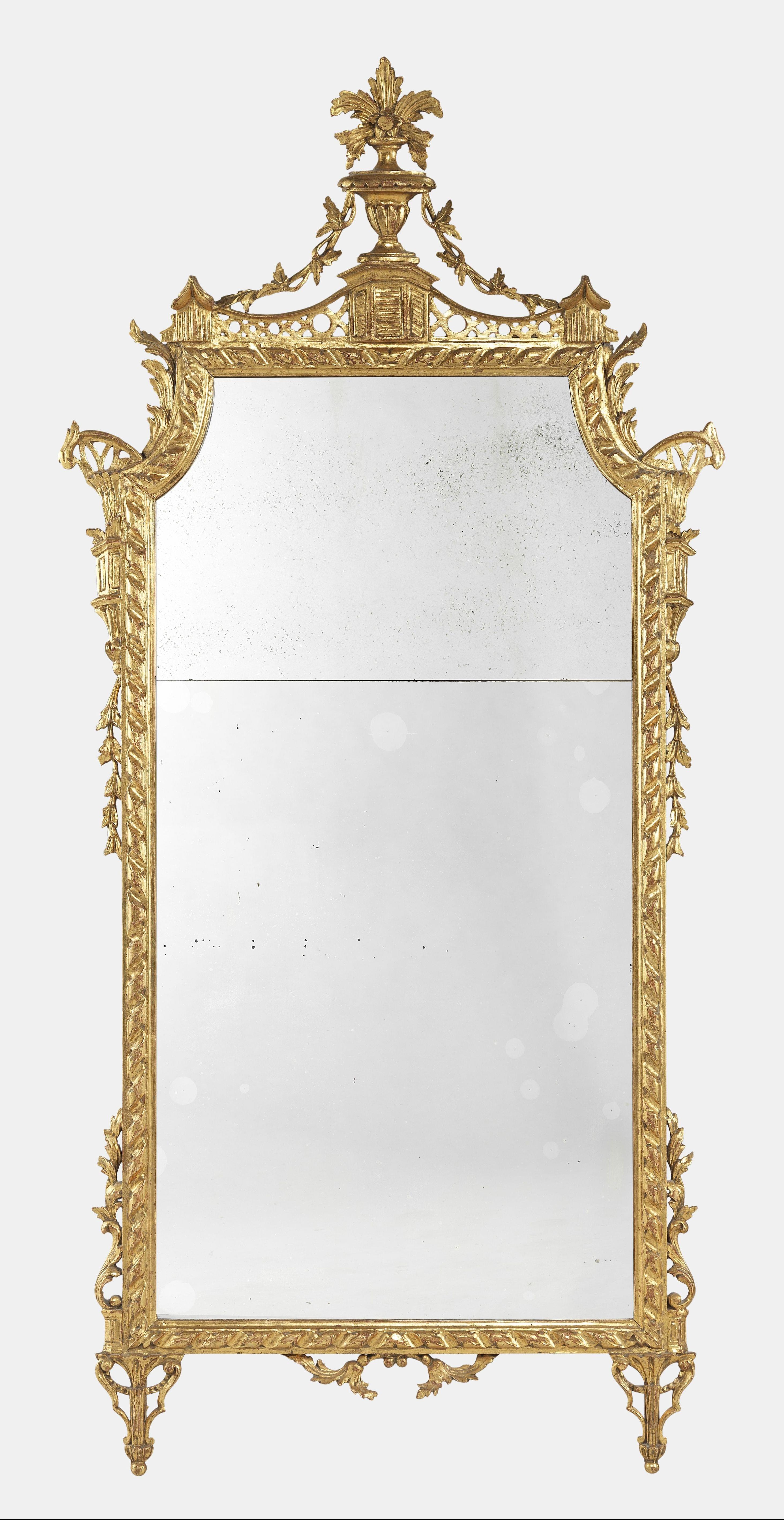 5360. Miroir à fronton surmonté d'un vase fleurì, XVIIIe s