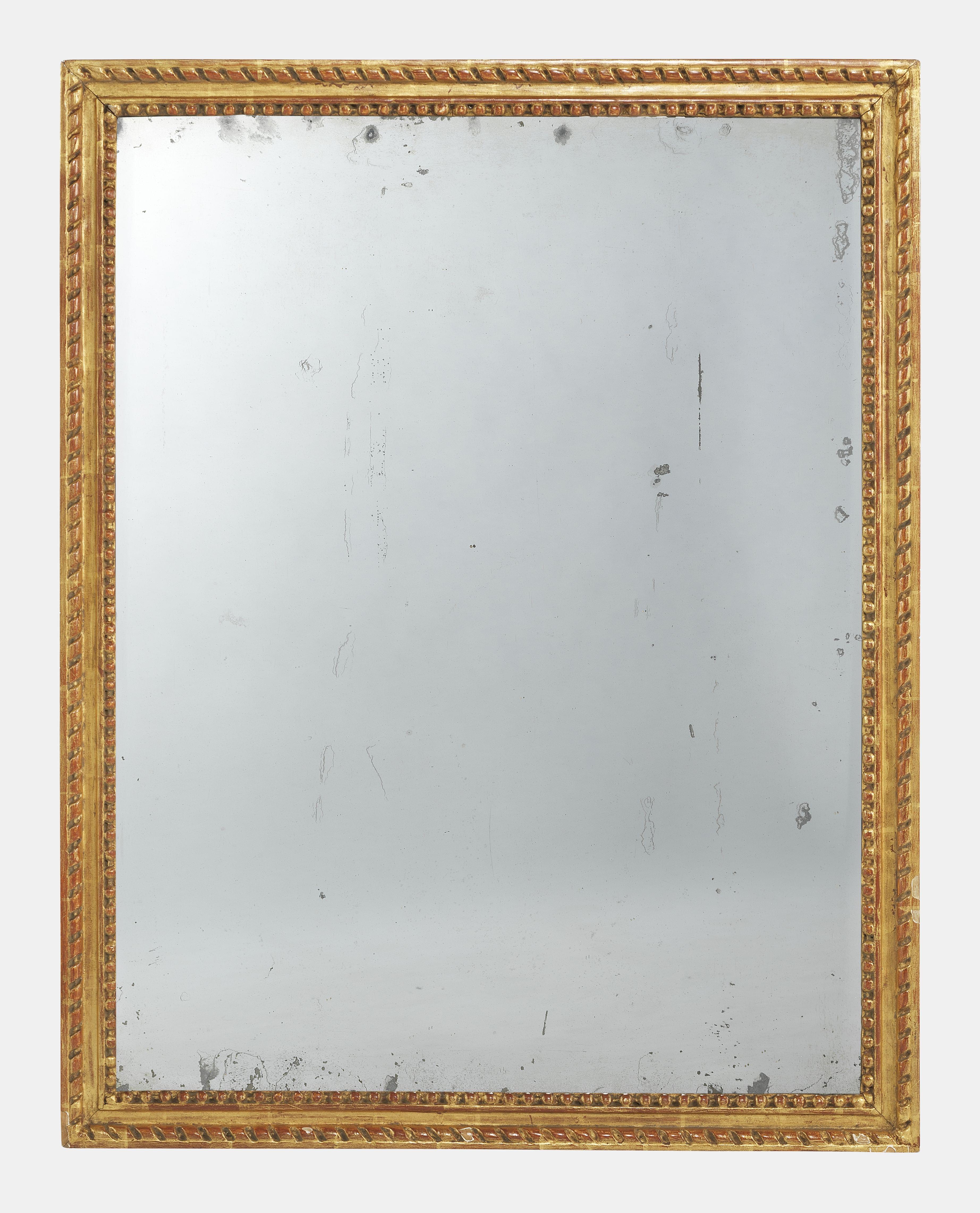 Bois sculpté et doré à motifs de frises de perles, glaces au mercure,92x73 cm
