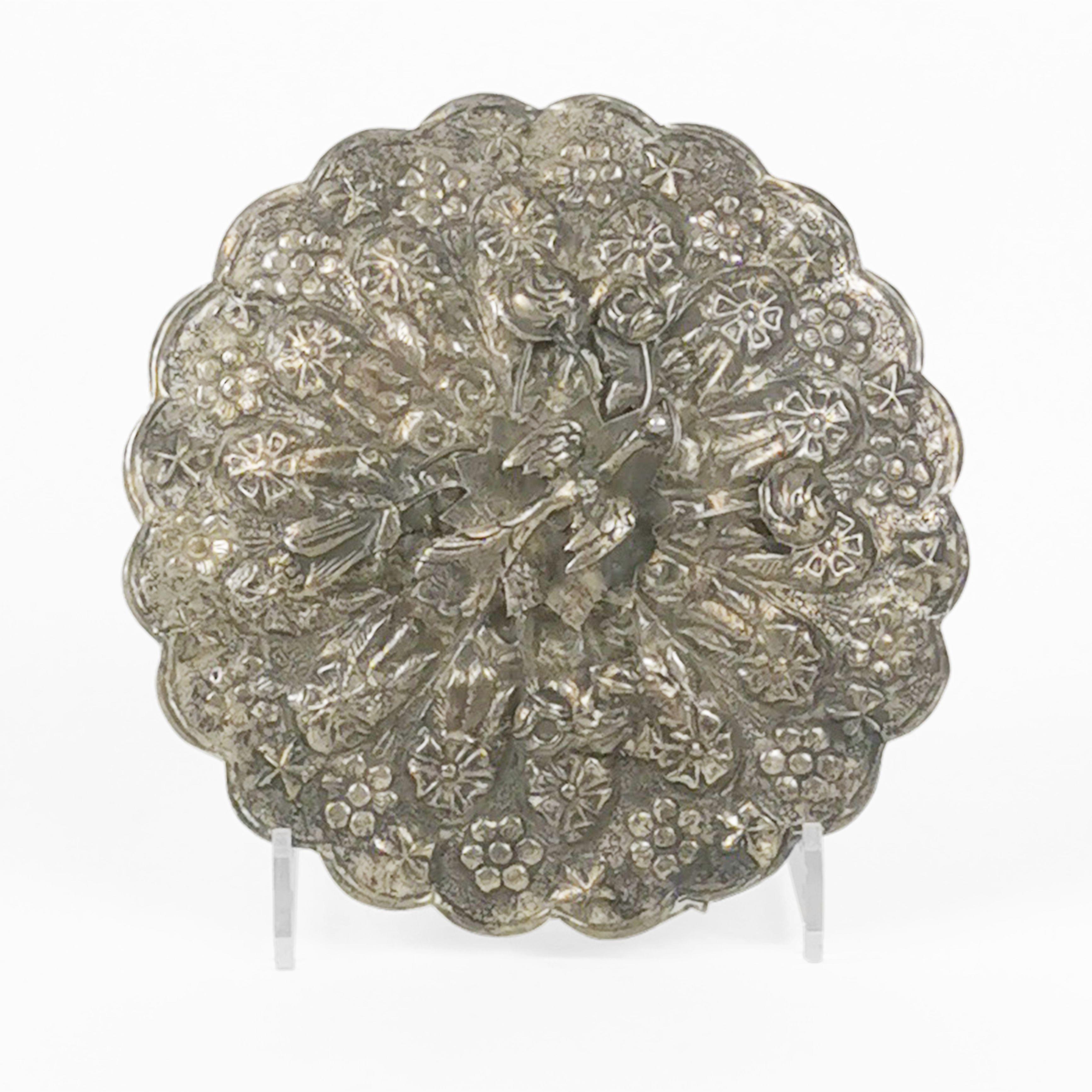 Argent repoussé, coiffé d'un oiseau, D 13 cm