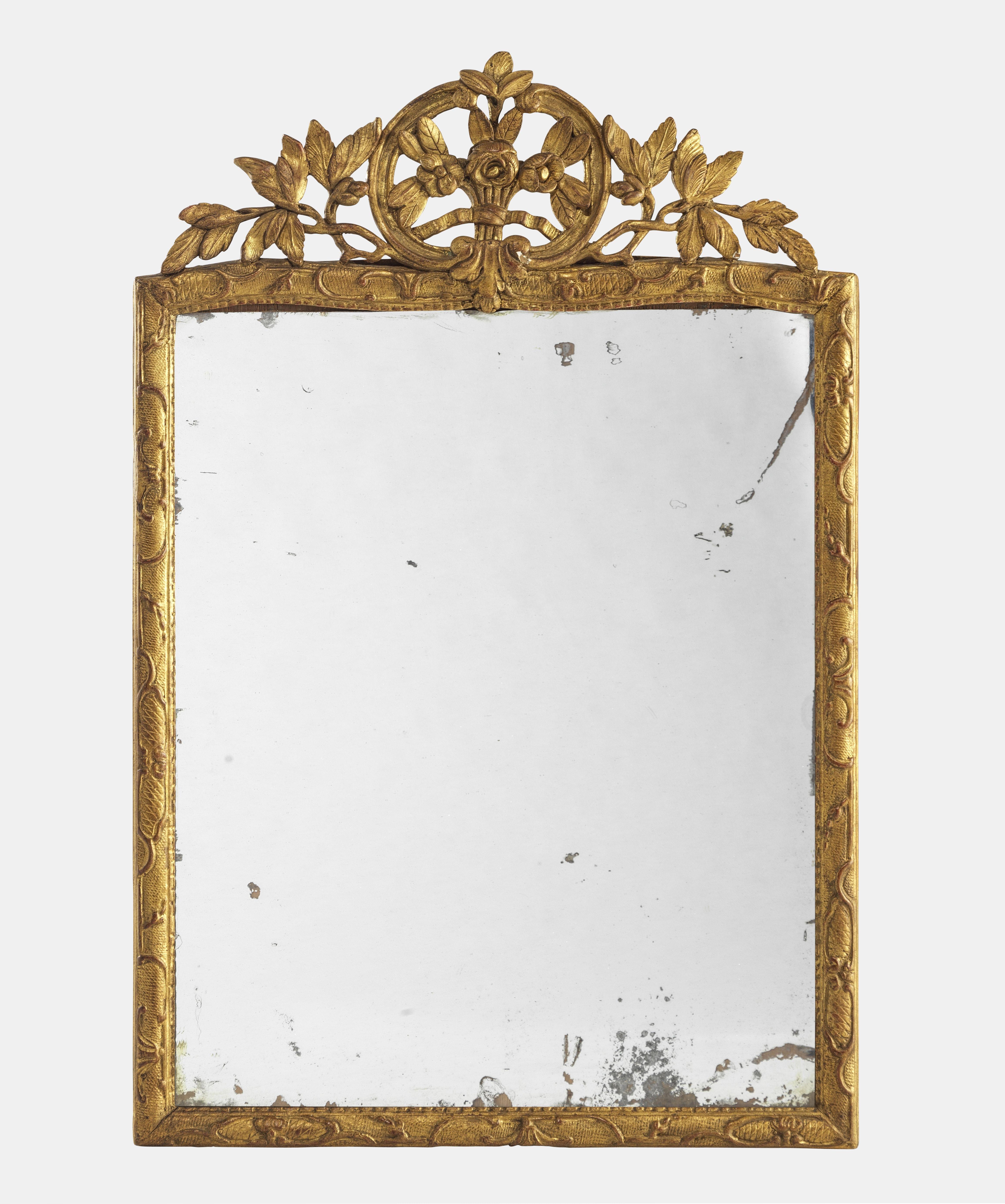 Bois sculpté doré, à motif de fleurs et rameaux, glace au mercure, 90x57 cm