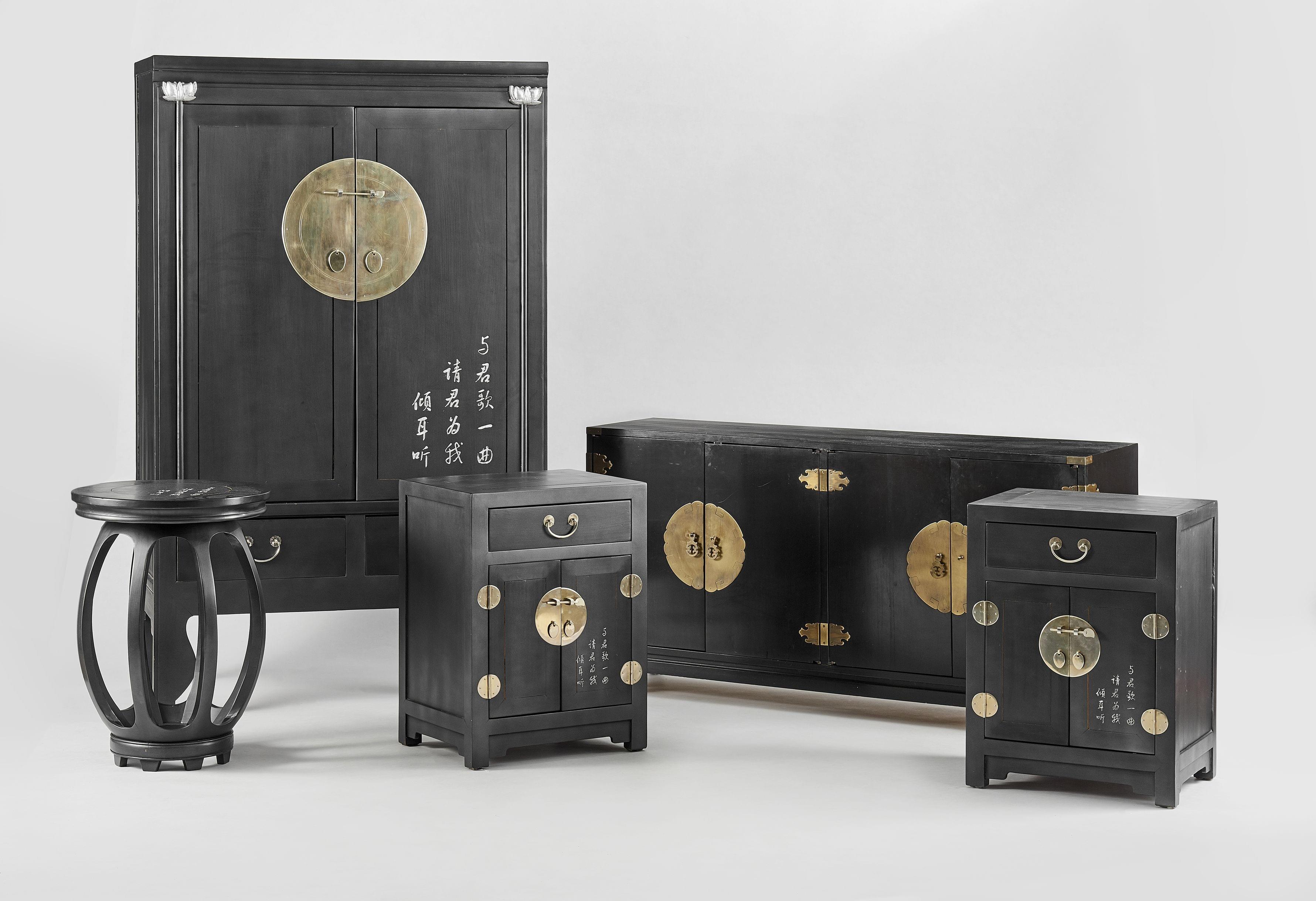 Comprenant une armoire, un buffet, deux chevet, un guéridon et un lit, bois laqué gris foncé. Provenance: collection Pernet-Villaverde