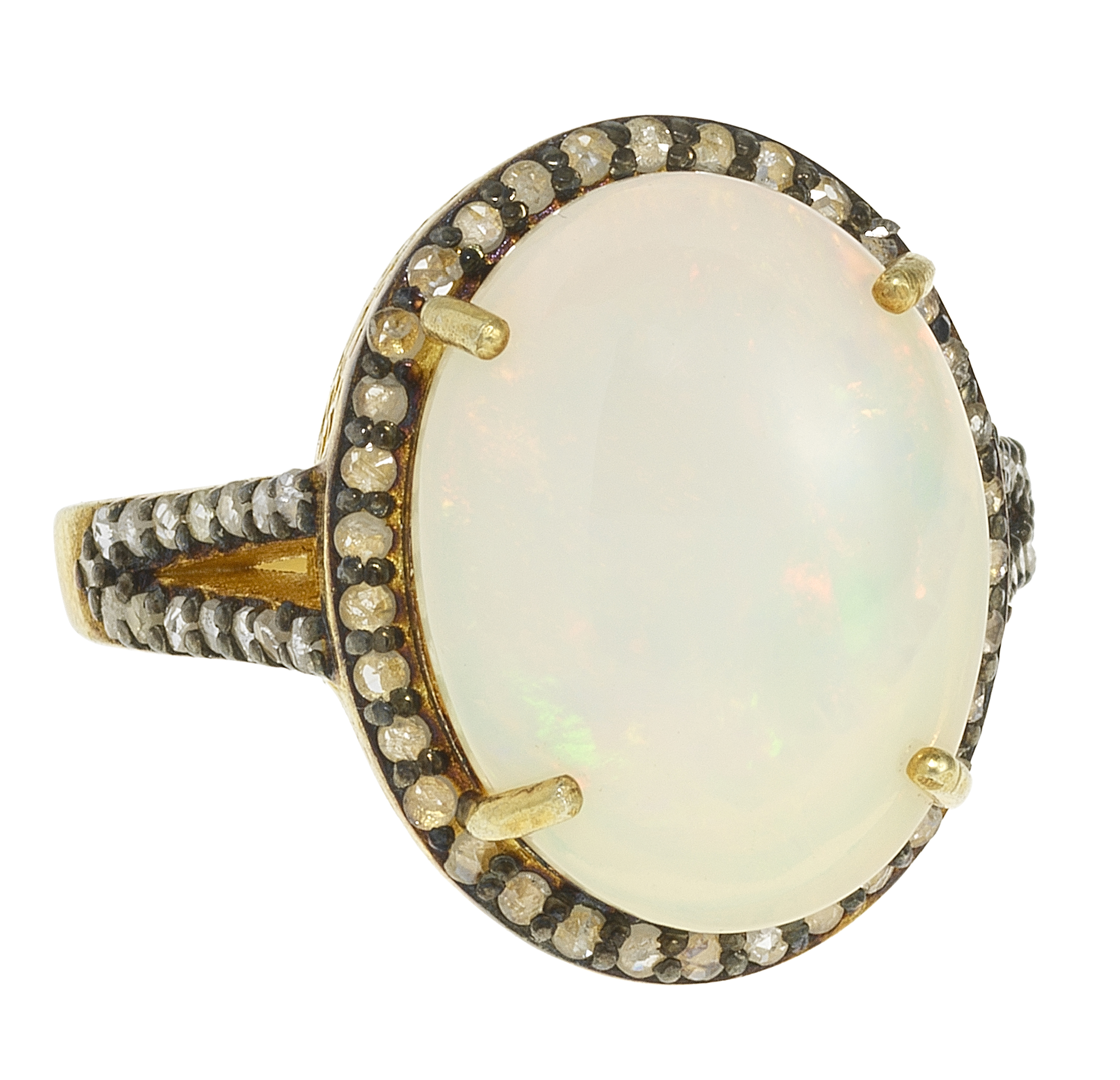 4171. *Bague sertie d'une opale à fond blanc taille cabochon ovale
