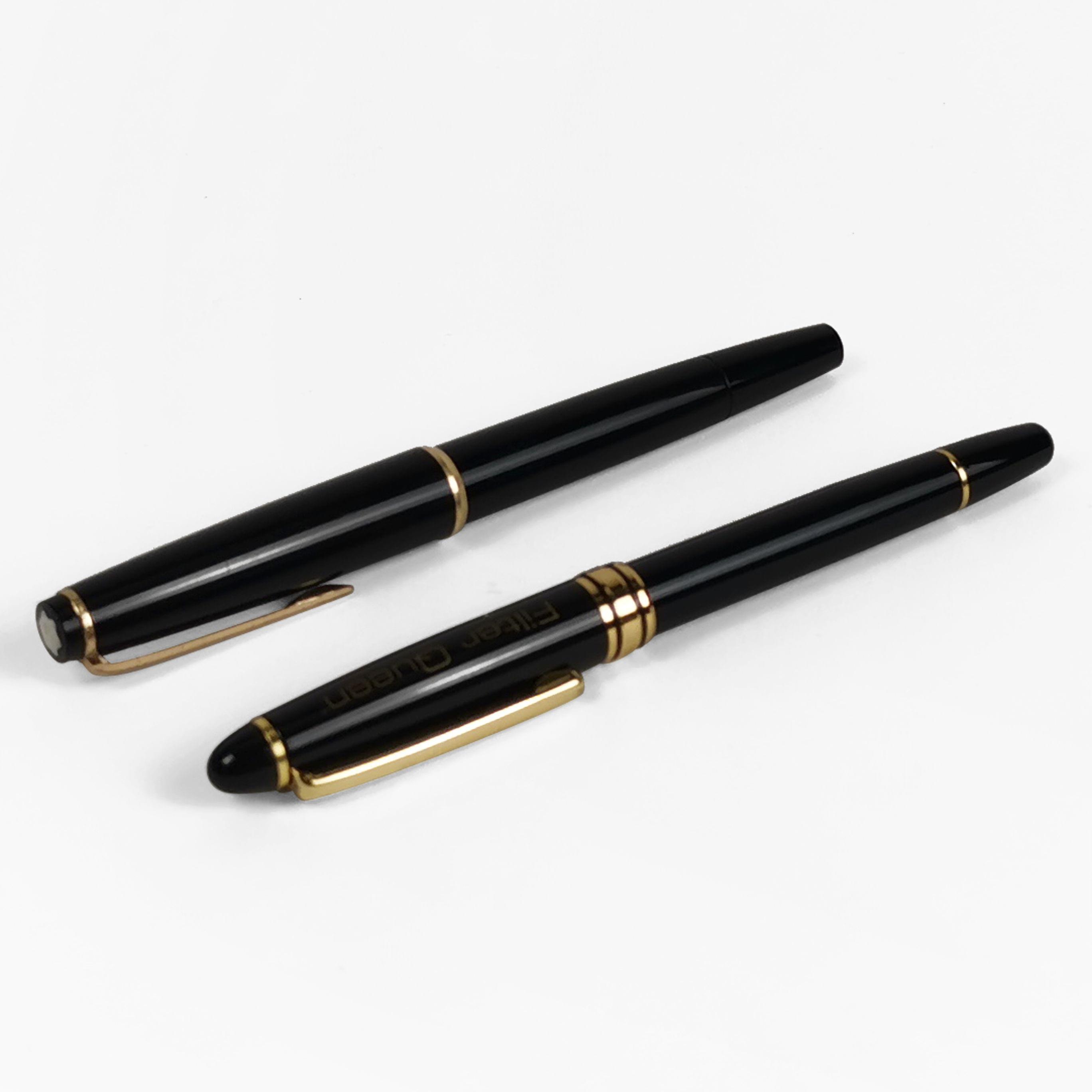 Laque noire et métal doré, plume en or 750, L 13,5 cm. On joint un stylo-plume Filter Queen en laque noire et métal doré, L 13,5 cm