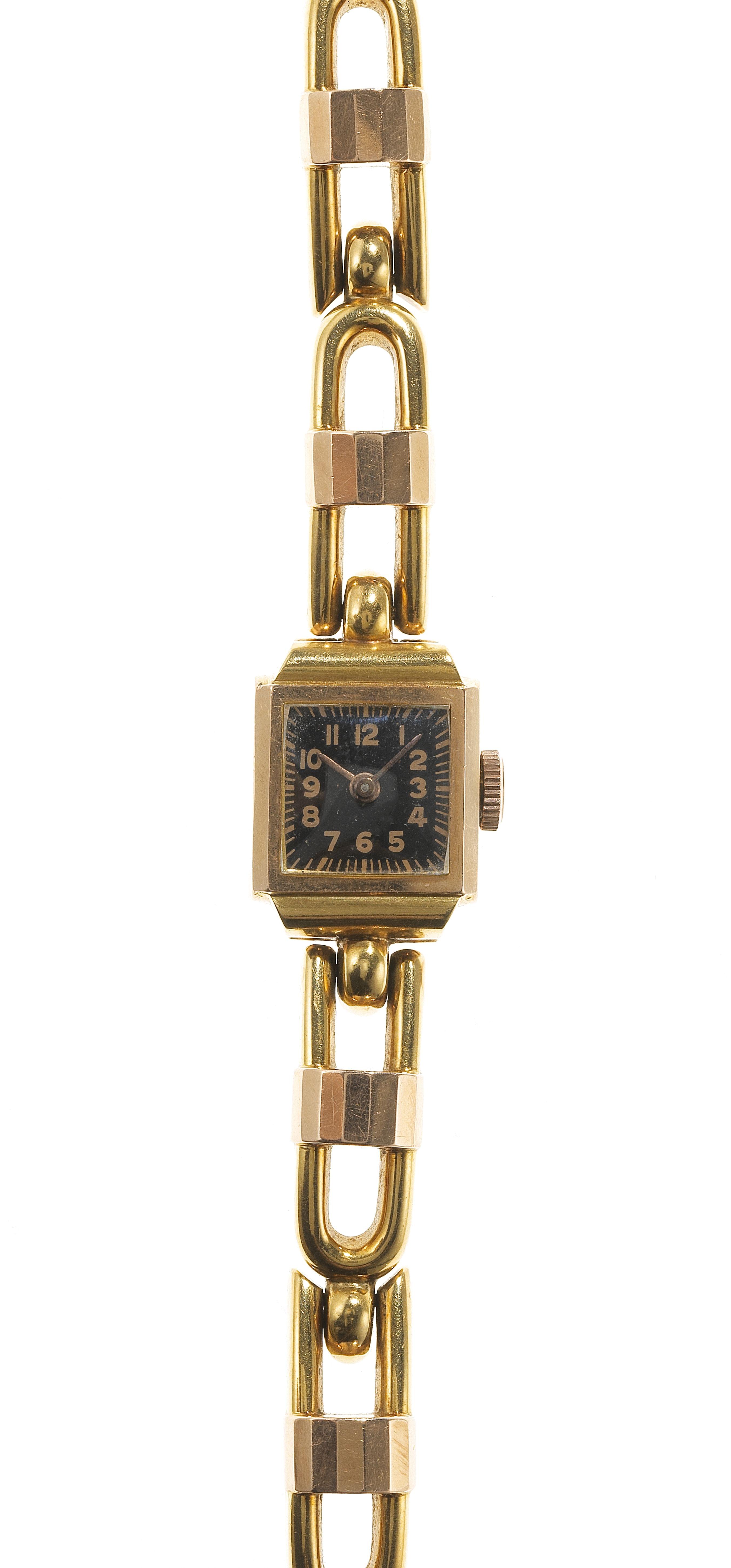 Cadran noir, aiguilles et chiffres romains dorés, or 585, poinçons hongrois, 13x13 mm, L 16,5 cm, poids brut 17 g. Provenance Habsbourg: succession de l'archiduc Albert II d'Autrich-Teschen
